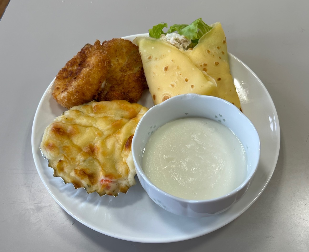 研修会では、地産地消クッキングで紹介する米粉を使用した4品のレシピ「グラタン」「クリームコロッケ」「プリン」「クレープ」を調理しました。渡辺会長は「米粉はダマになりにくく調理にとても使いやすい。ぜひ米粉の良さをPRしよう」と呼び掛けました。