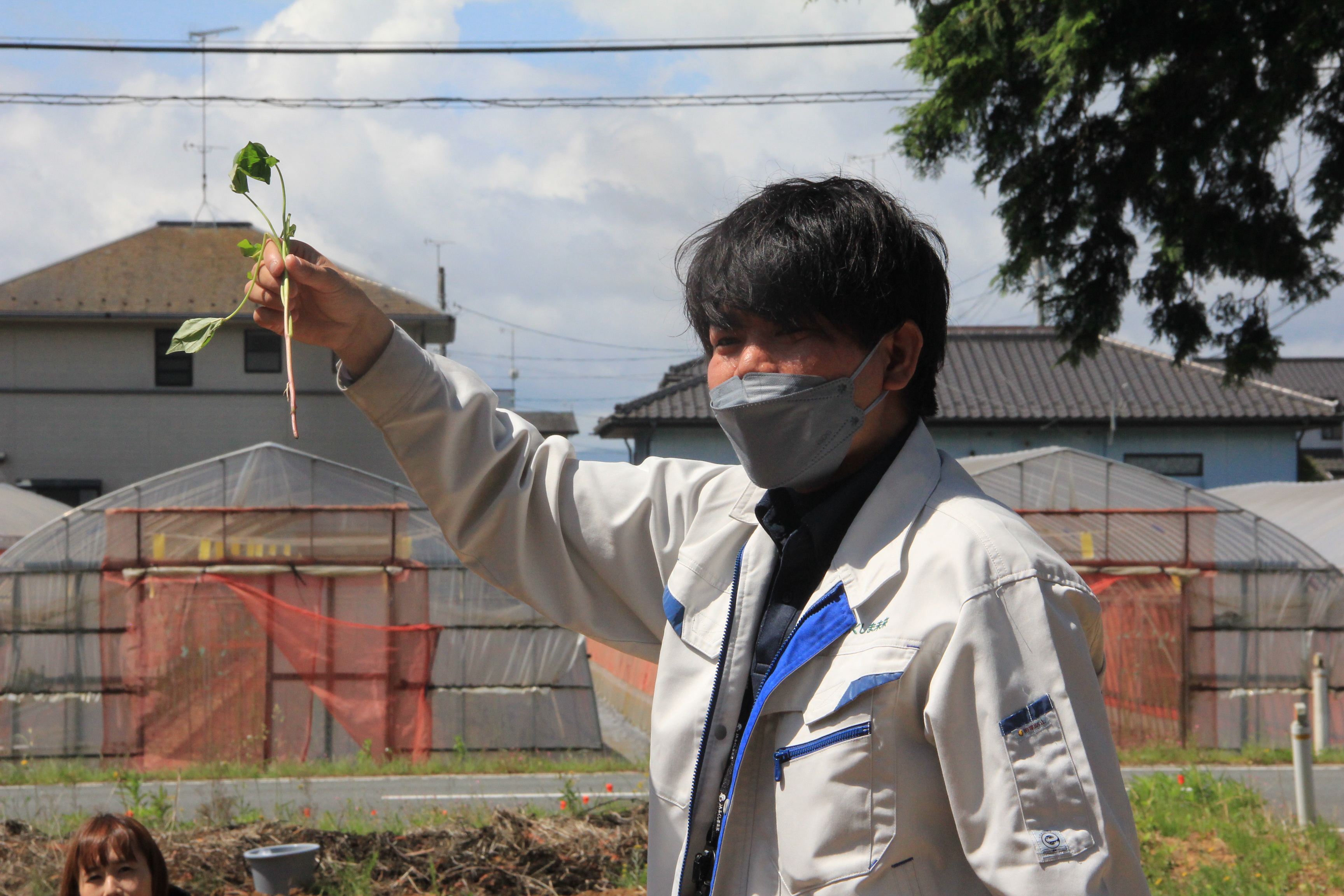 体験では、園児や保護者、先生37人が参加し、サツマイモ「紅はるか」240本を定植しました。そうま地区地域支援課の高田優作さんが園児らに定植前の準備や定植の仕方について説明しました。