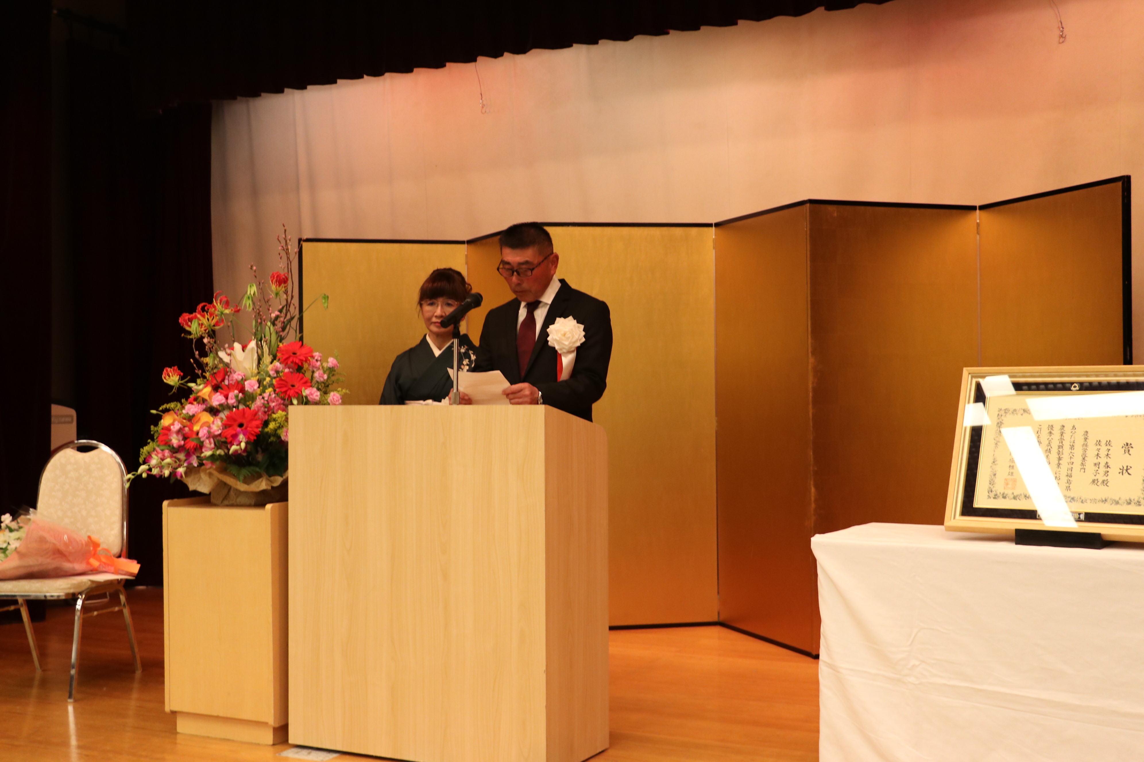 同JA伊達地区生産部委員会鈴木聡委員長は「人とのつながり、地域とのつながりを大切にしている佐々木ご夫妻であり、いつでも頼れる存在でいてほしい」と発起人代表としてあいさつ。出席者から佐々木さん夫妻に記念品が贈られ、ご夫妻のお孫さんから花束が贈られました。