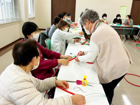 当JA女性部伊達総合支部は20日、伊達支店にて伊達総合支部クラフトテープリースづくり教室を開き、部員22名が参加しました。大田支部の舟山みつ子さんと富田キヨさんが講師を務めました。教室では2本の長いクラフトテープを使い交互に編んでクリスマスリースを作りました。参加した部員は、「頭の体操になった。作るのは大変だったが良くできた」と話しました。
