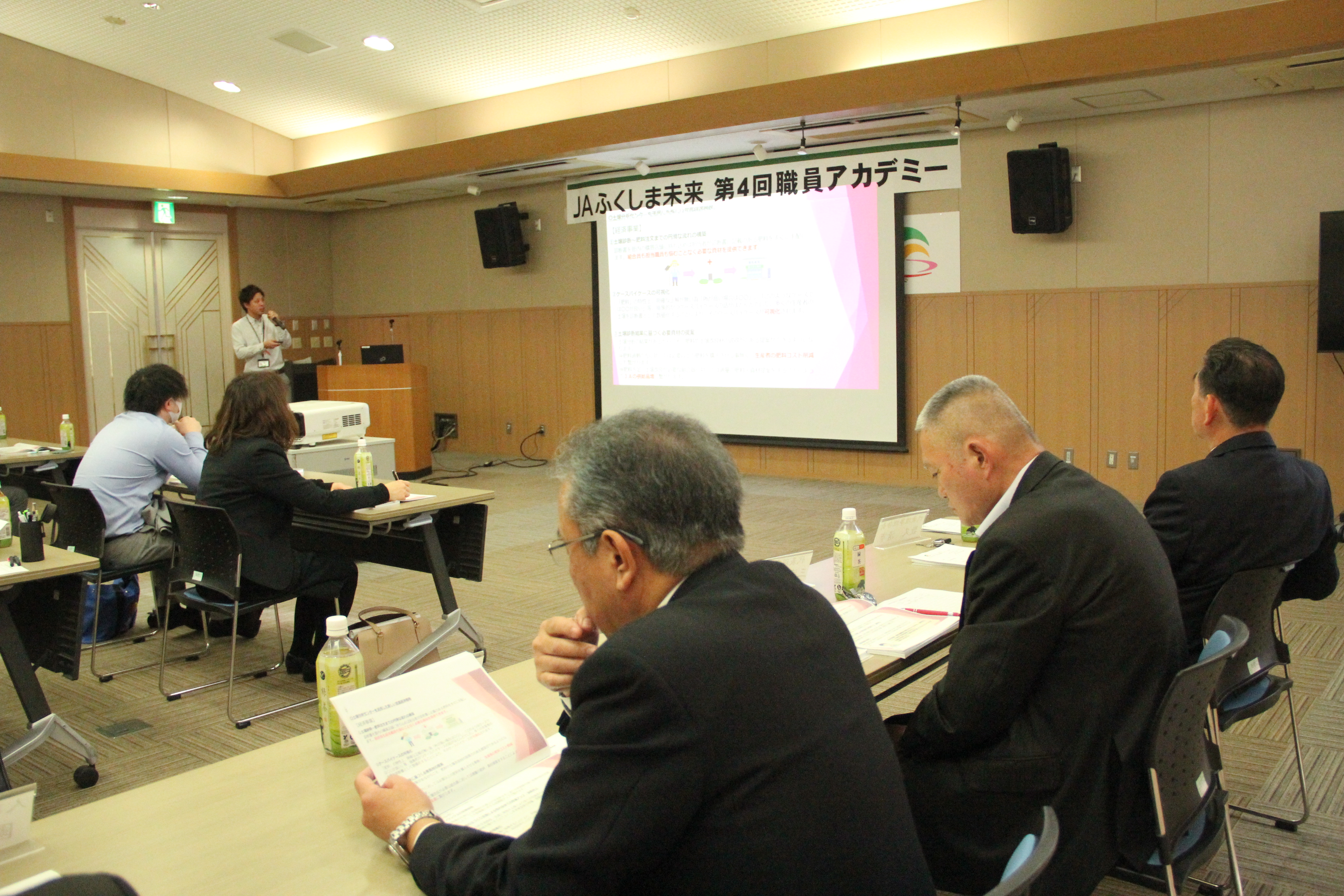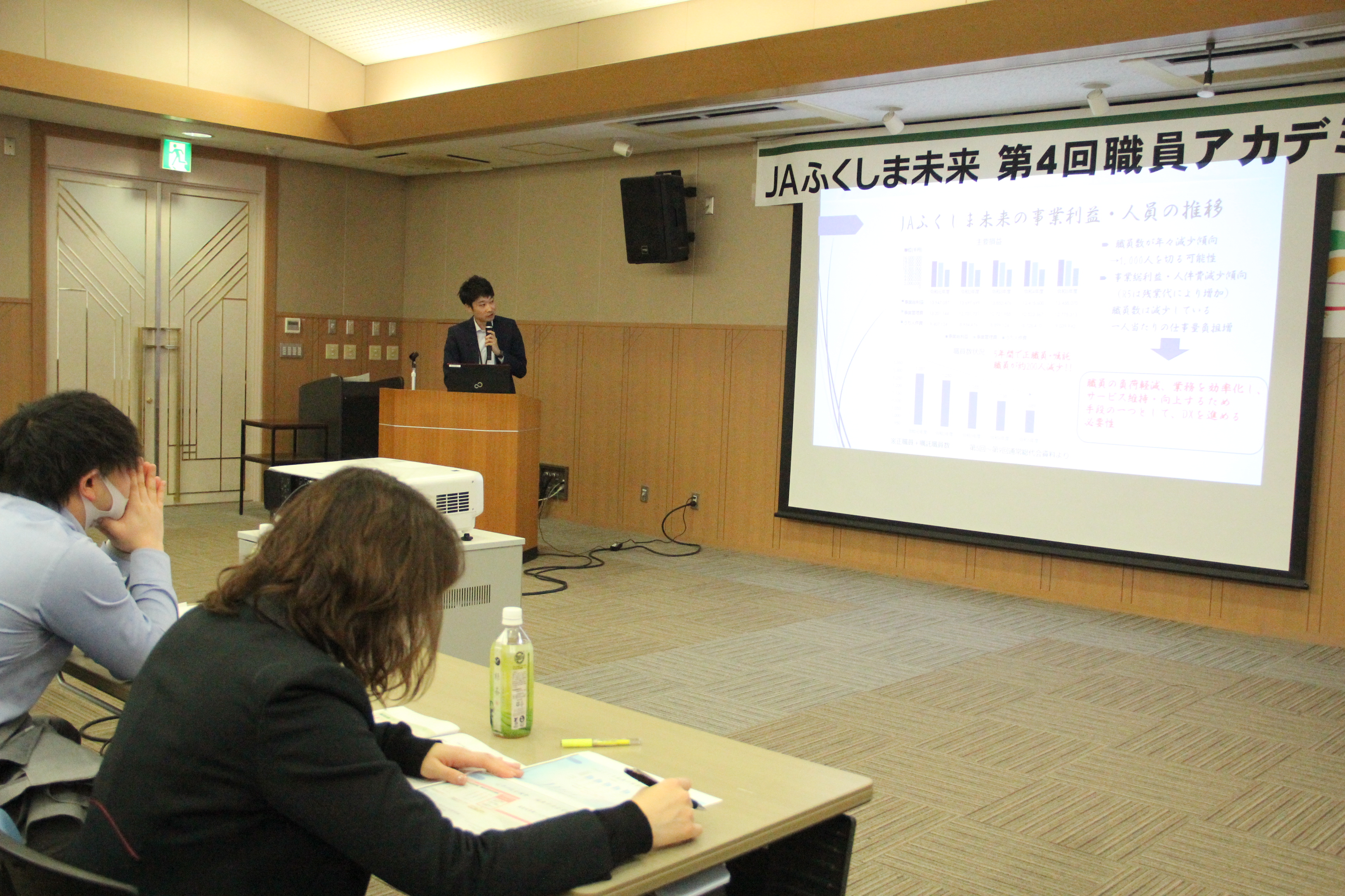 当JAは17日、JA北信支店で30代から40代の基幹職員を対象に第4回職員アカデミーを開き、提案発表の最優秀賞に伊達地区地域支援課の吉田桃子さんを選出しました。今年度から新たに始まった職員アカデミーでは、JAが10年、20年先の農業にどう貢献していくか考えます。これまで受講者は数又清市組合長の講話やパワーポイントの使い方、コミュニケーション育成術などの講演を受けてきました。