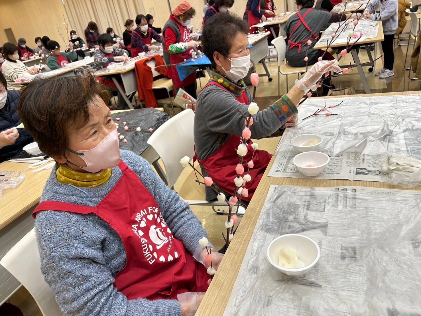 同支部では、毎年五穀豊穣や災害なく今年一年健康で過ごせるよう願いを込めて制作しており、稲穂飾りで使用する紅白もちは部員が毎年手作りしています。今回はミズキの木を使って稲穂飾りを制作しました。