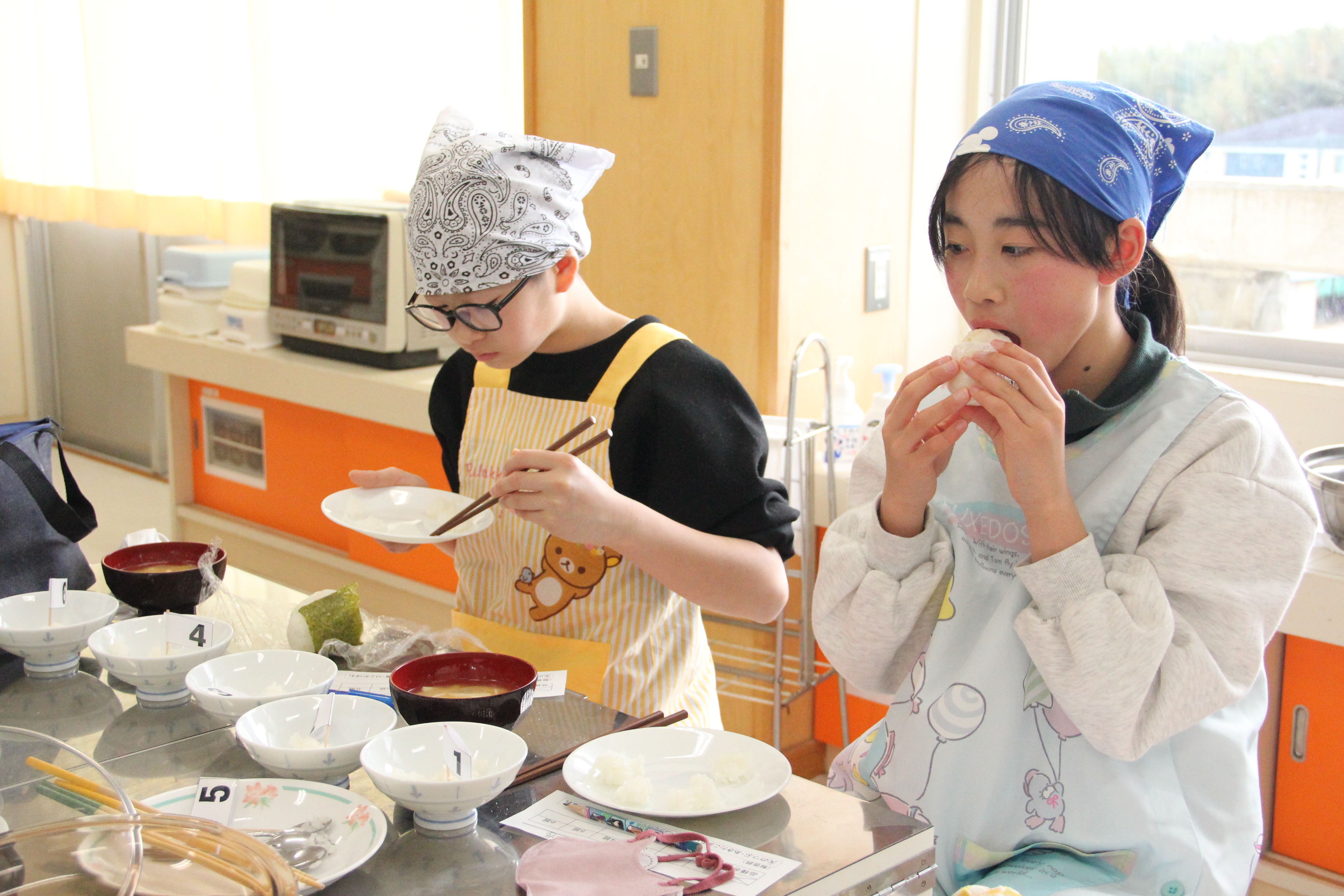 米の試食では、児童らが品種ごとの特徴を学んだ上で、米を食べ比べして品種当てクイズを行いました。米を試食した児童は「もちもちしていておいしい。でも、どれがどの品種か全然わからない」と頭を悩ませました。