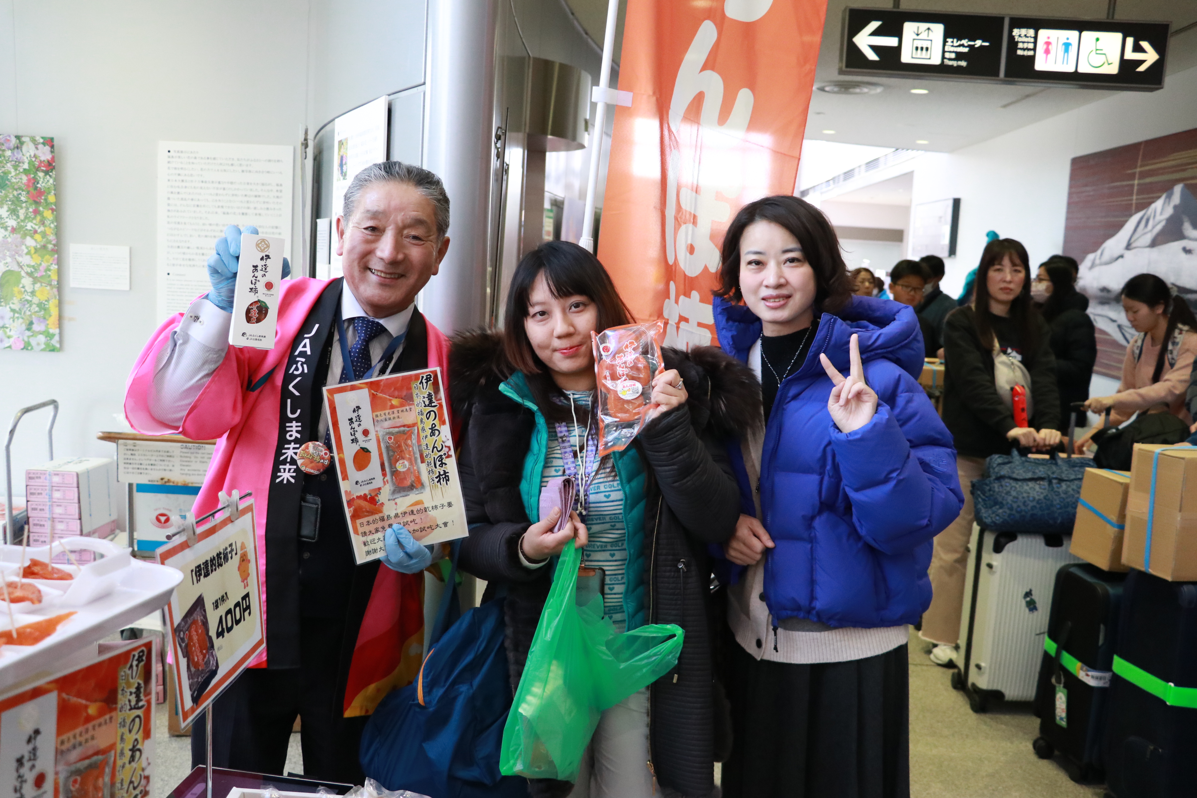 試食会は国際線到着ロビーで開催し、JA販売担当者やJA農産物PR隊「J―FAP」がPR。担当者は「空港で福島の農産物に触れて魅力を感じてほしい」と呼びかけました。多くの台湾からの旅行客や県内外の観光客が伊達のあんぽ柿を手に取り試食しました。試食した台湾からの旅行客は「甘くておいしい。冷凍でも楽しめるのは魅力的だ」と話しました。