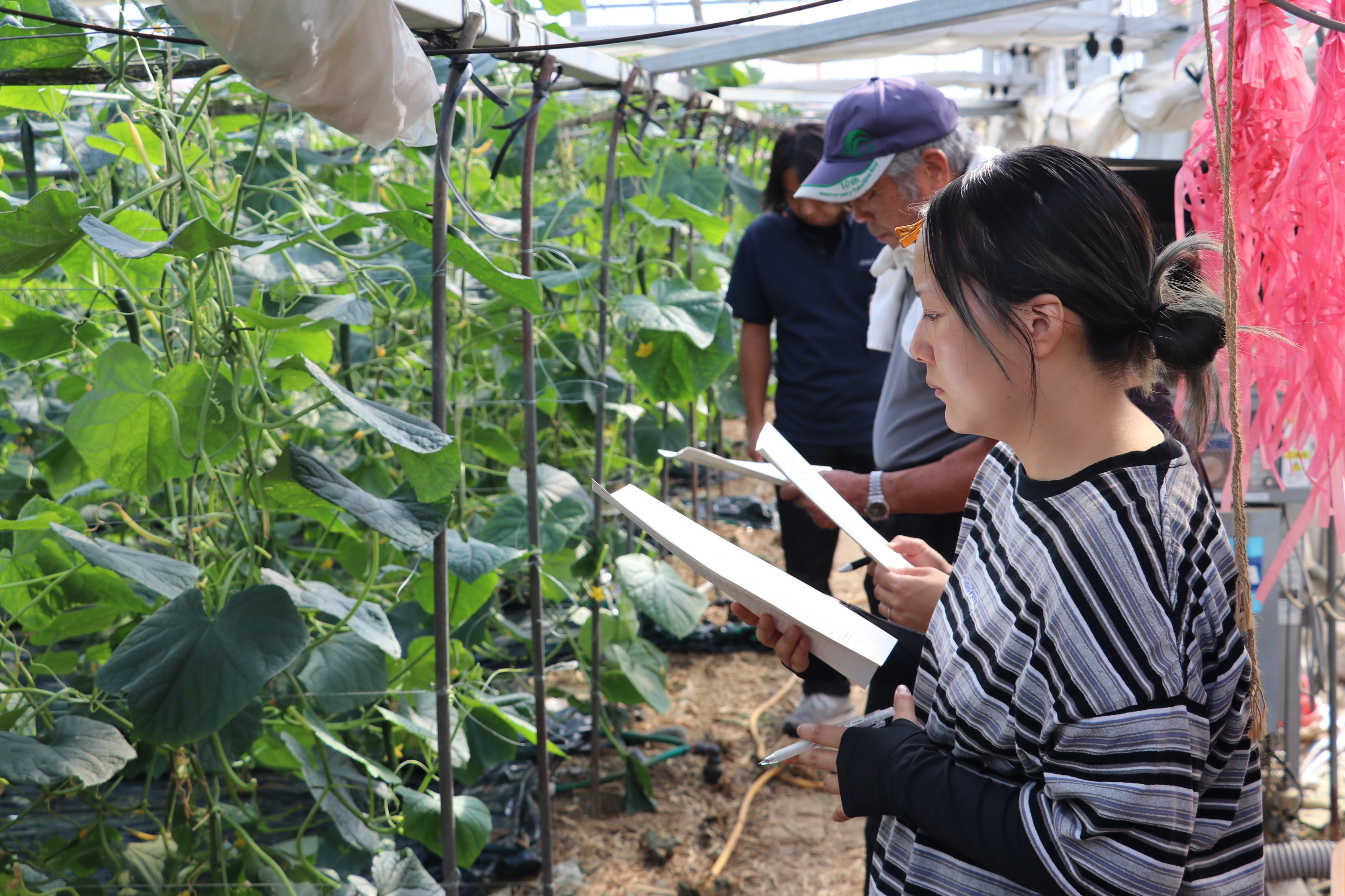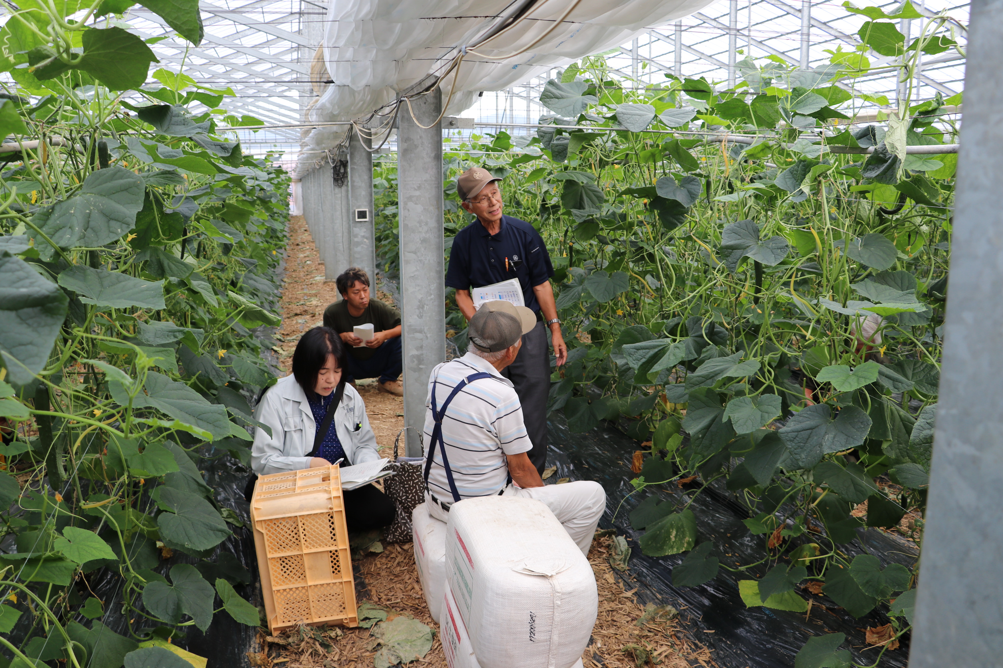 当JAふくしま未来福島地区きゅうり専門部会東部施設班は19日、福島市の圃場で抑制キュウリの現地指導会を開き部員12人が参加しました。