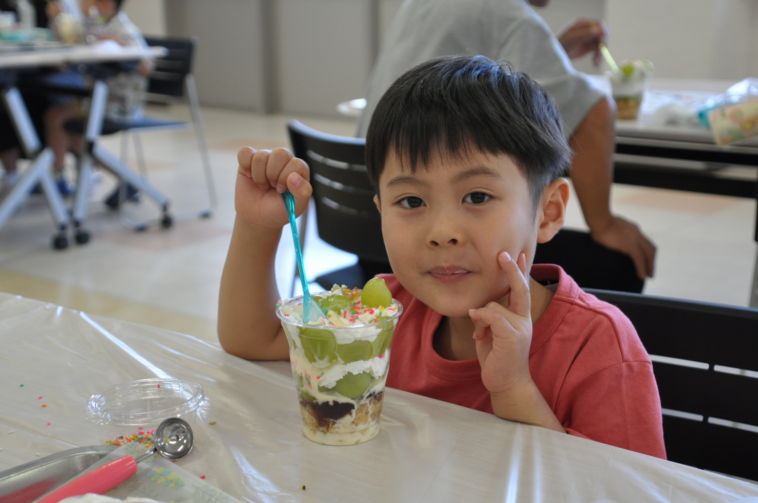 JA土壌分析センターでは、稲村典幸職員から土壌分析の流れについて説明を受けました。みらいホールやながわでは、梁川営農センターの梅津英幸センター長がシャインマスカットについて説明。参加者は梁川産のシャインマスカットを使ってパフェづくりに挑戦し、思い思いのパフェを完成させ味わいました。子どもから大人まで「とても楽しい時間だった」と笑顔を見せました。