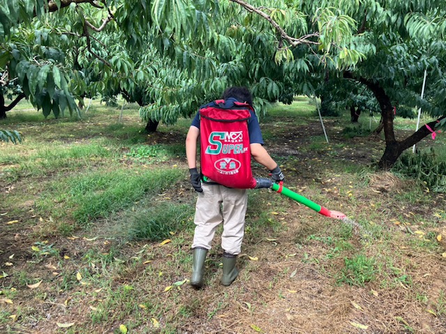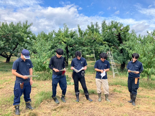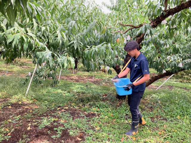 研修では、収穫後の桃の樹勢回復や翌年の品質向上を目指し、適切な施肥方法を現場で確認。参加者は実際に肥料を施しながら、施肥量や時期、注意点について意見を交わしました。また、秋期剪定のポイントについても指導があり、樹形や枝の状態を見極めながら作業を進めました。
