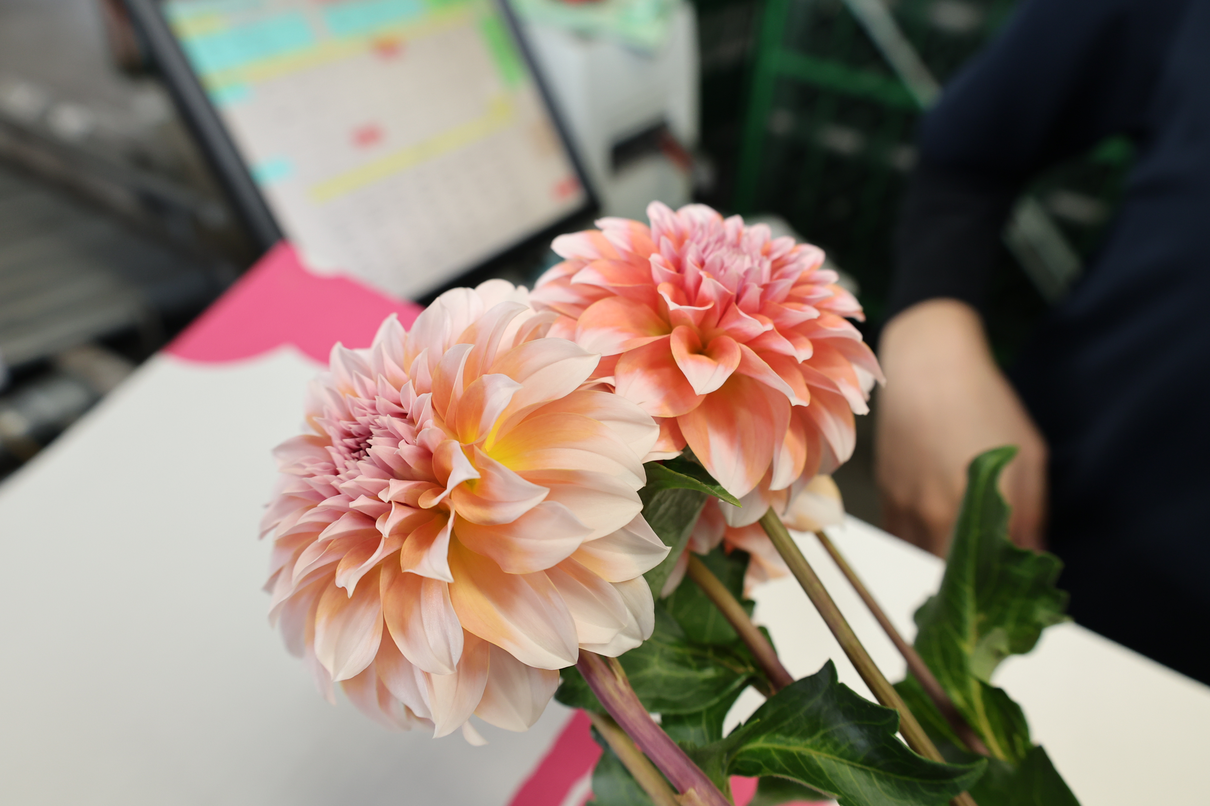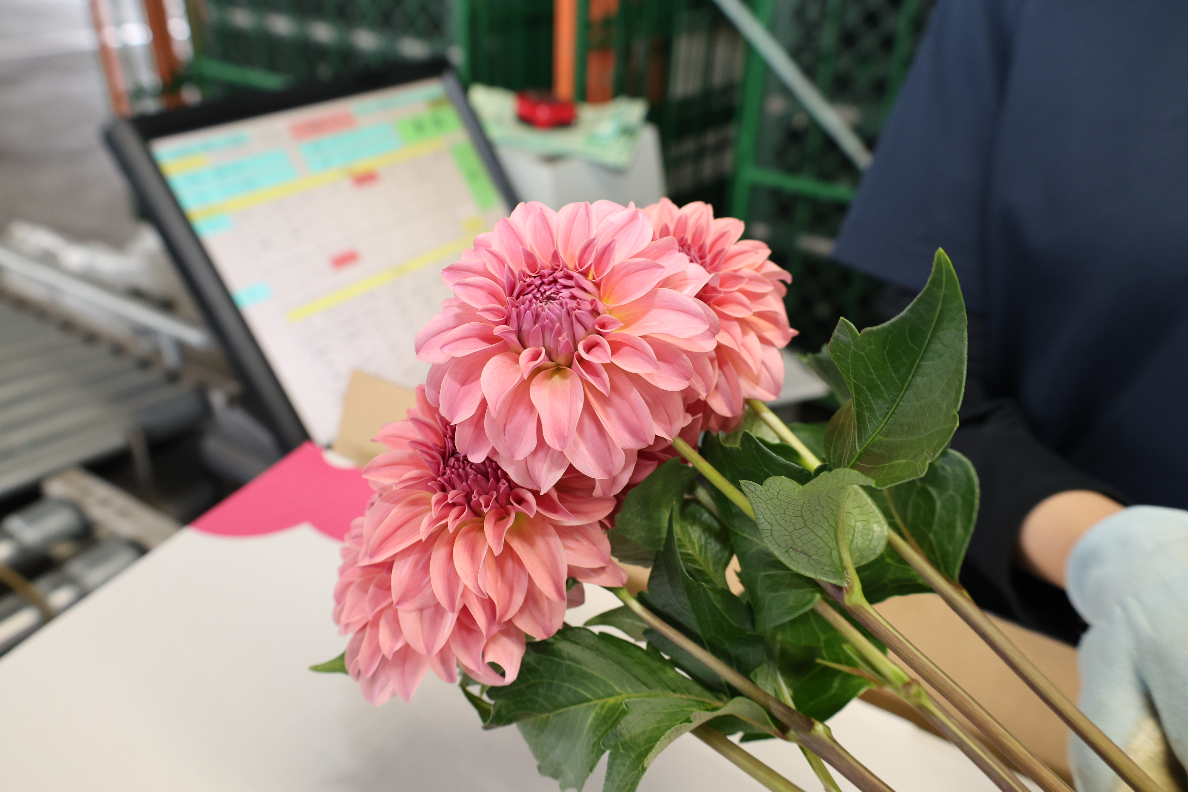 今年は8月の高温と乾燥により、例年より5日ほど遅い8日に出荷が始まりました。水を与えすぎても花の咲き方等品質に影響してしまうため、かん水のタイミングや施設内の温度管理に注意するよう呼びかけてきました。生産者からは栽培管理が難しかったという声が聞かれたものの、現時点では安定した品質のダリアを出荷できています。