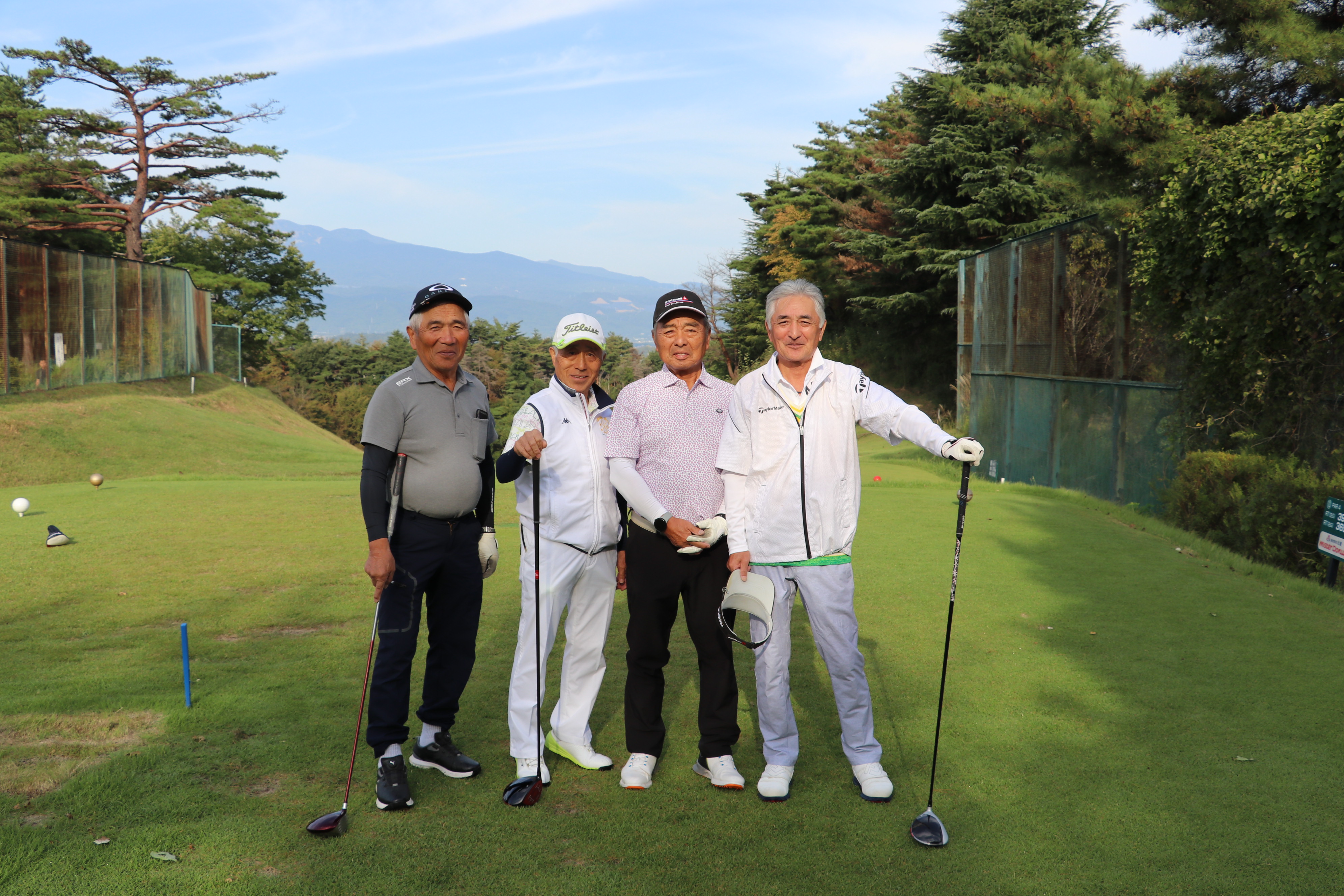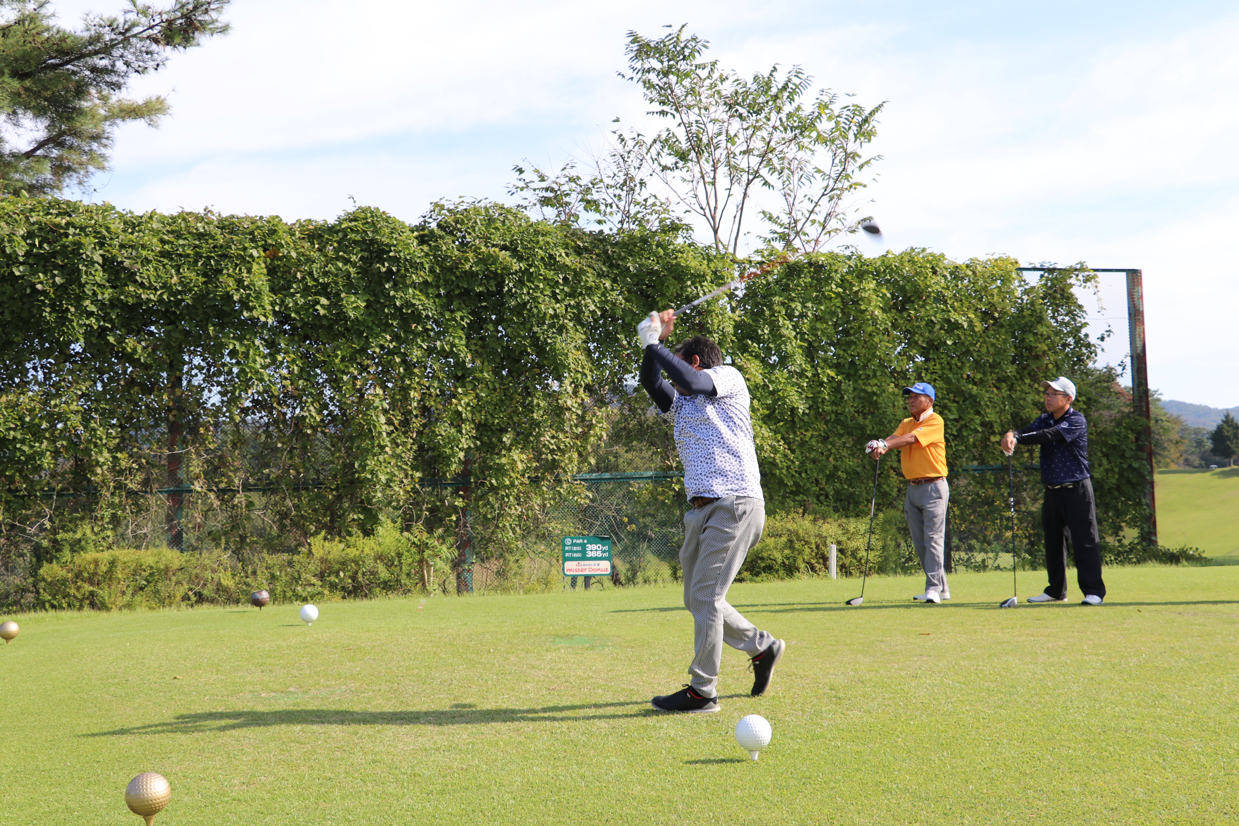 コンペは、アウト・インのそれぞれのコースよりスタートし18ホールでプレーを楽しみました。プレー終了後「ウェディングエルティ」にて表彰式を開きました。ドラコン・ニアピンなどのアトラクション、最高齢の参加者(高橋 祐一さん)には最高齢賞が贈られました。
