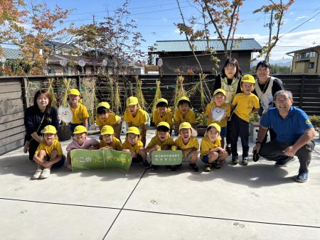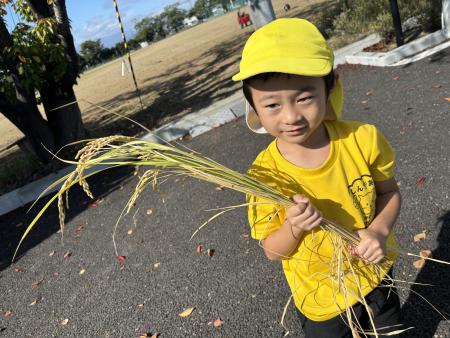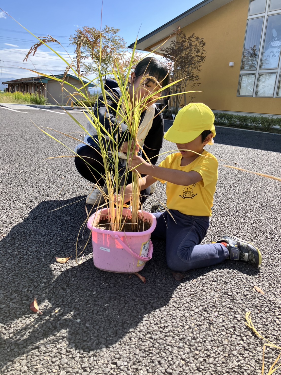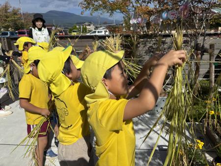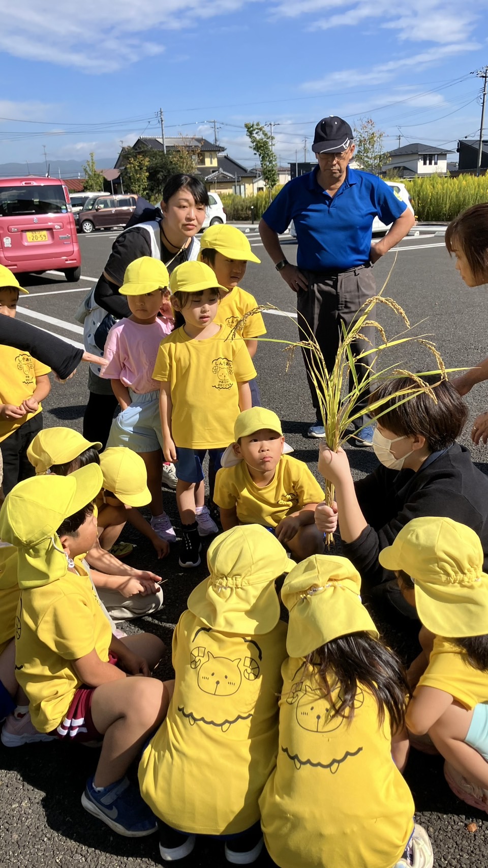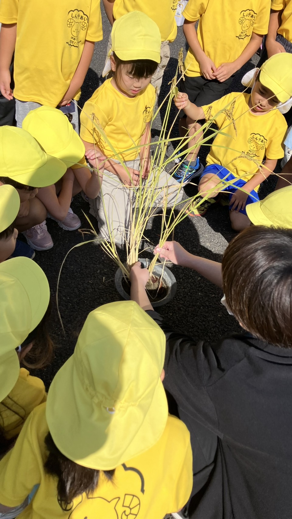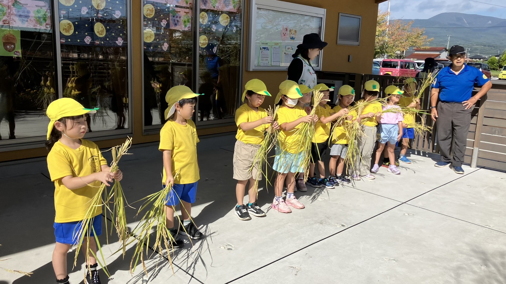 JA職員が稲刈りの方法を指導し、園児ははさみを使って稲を刈り取りました。刈り取った稲は麻ひもで結び、園の玄関前に干しました。春から自分で世話をしてきた苗に米が実り、無事収穫できた園児たちは「自分で育てたお米を早く食べてみたい」「自分で育てた稲が1番かわいい」と話し、とても嬉しそうな様子でした。