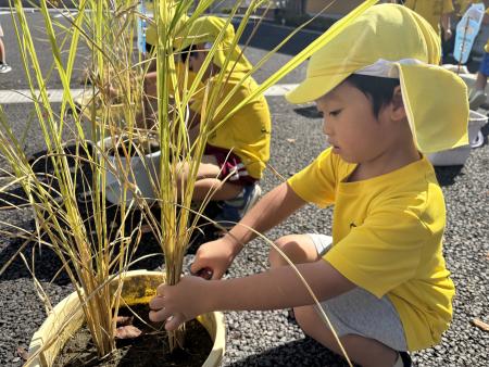 当JA伊達地区本部は8日、伊達市の伊達・ひかり認定こども園で第5回「おこめっこ大作戦!」を開催しました。通年で行うJA食農教育事業の一環。この日は年長組の園児14人が参加し、バケツ稲の稲刈りをしました。5月に種もみ・芽出しを行い、児童全員のバケツに立派な穂ができました。