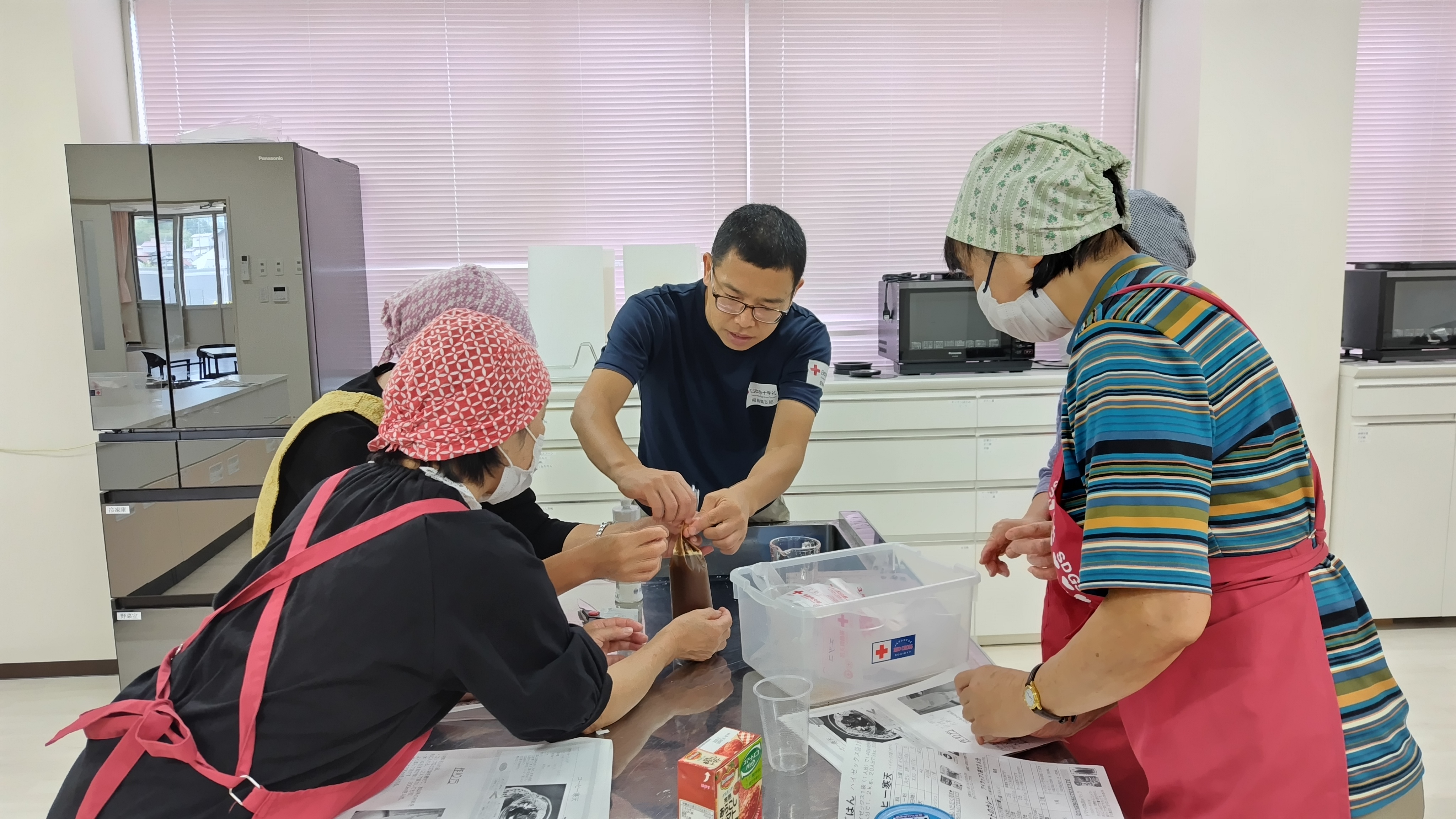 講師は日本赤十字社福島県支部事業推進課の野崎謙司係長が務め、災害時に簡単に作れるハイゼックス袋を使ったご飯の炊き方やコーヒー寒天、アイラップ袋を使ったさば缶とトマトの簡単カレーを調理しました。