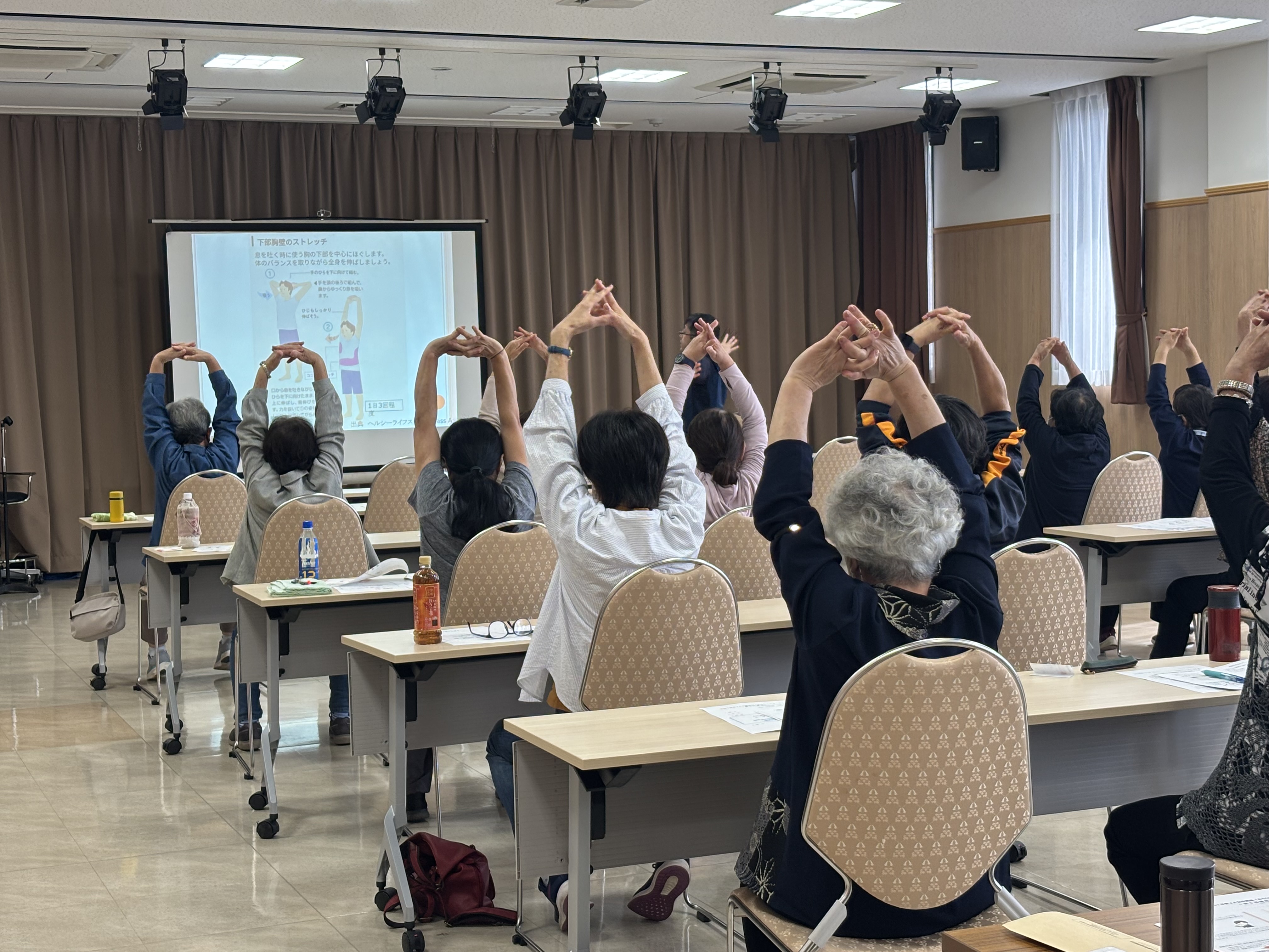 講師にはJA福島厚生連・鹿島厚生病院リハビリテーション科の理学療法士・横谷直俊先生を招きました。姿勢、呼吸の重要性や足部の役割を学び、おうちでも簡単にできるストレッチ方法を体験しました。