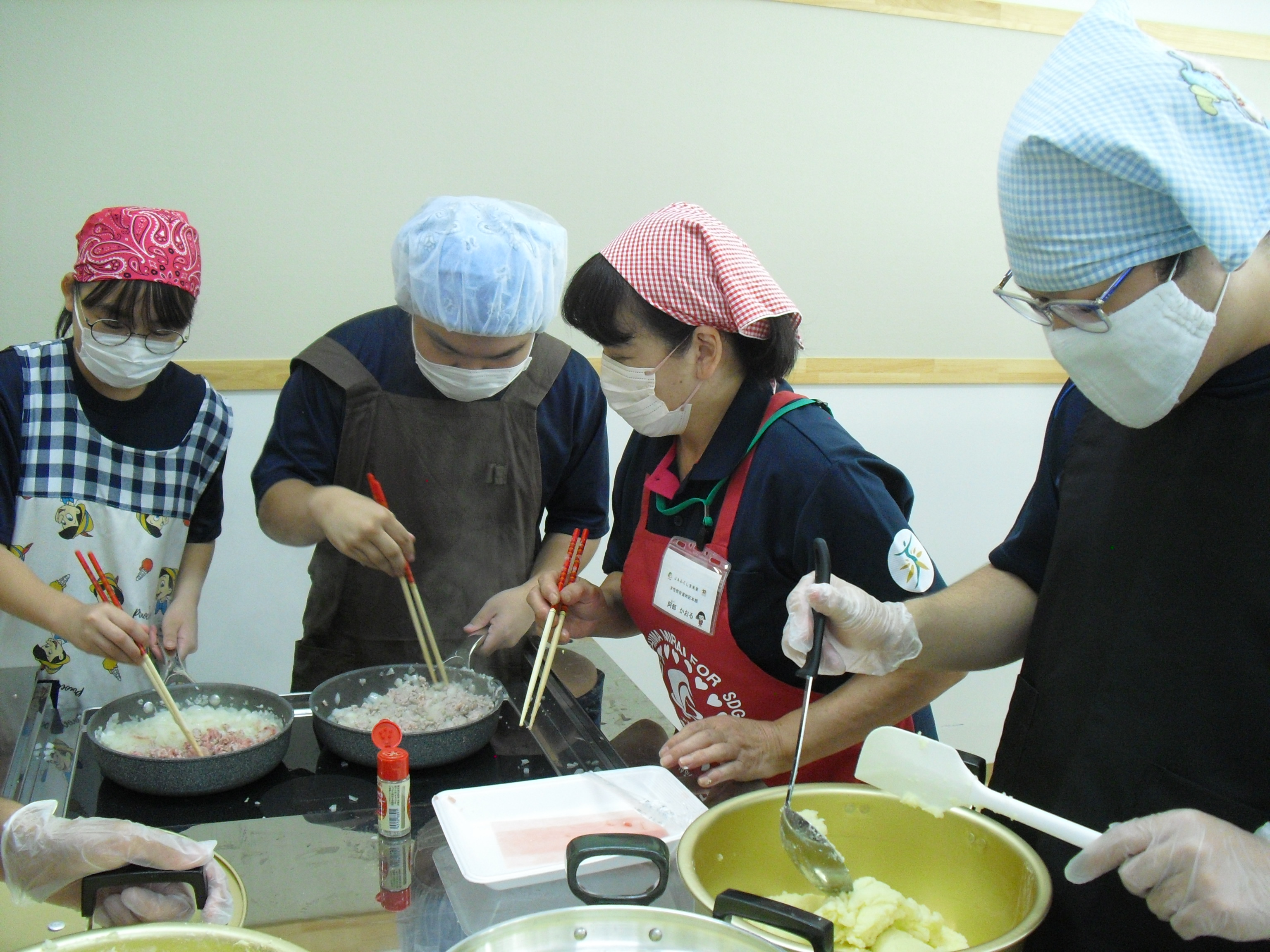おにぎりには、今年収穫されたばかりの大玉村産コシヒカリを使用。女性部役員がオリジナルのポテトサラダの作り方を伝授する場面もあり、生徒たちは野菜を切ったり、具材を混ぜたり、油で揚げたりと、役員の指導のもと一生懸命に調理に取り組みました。