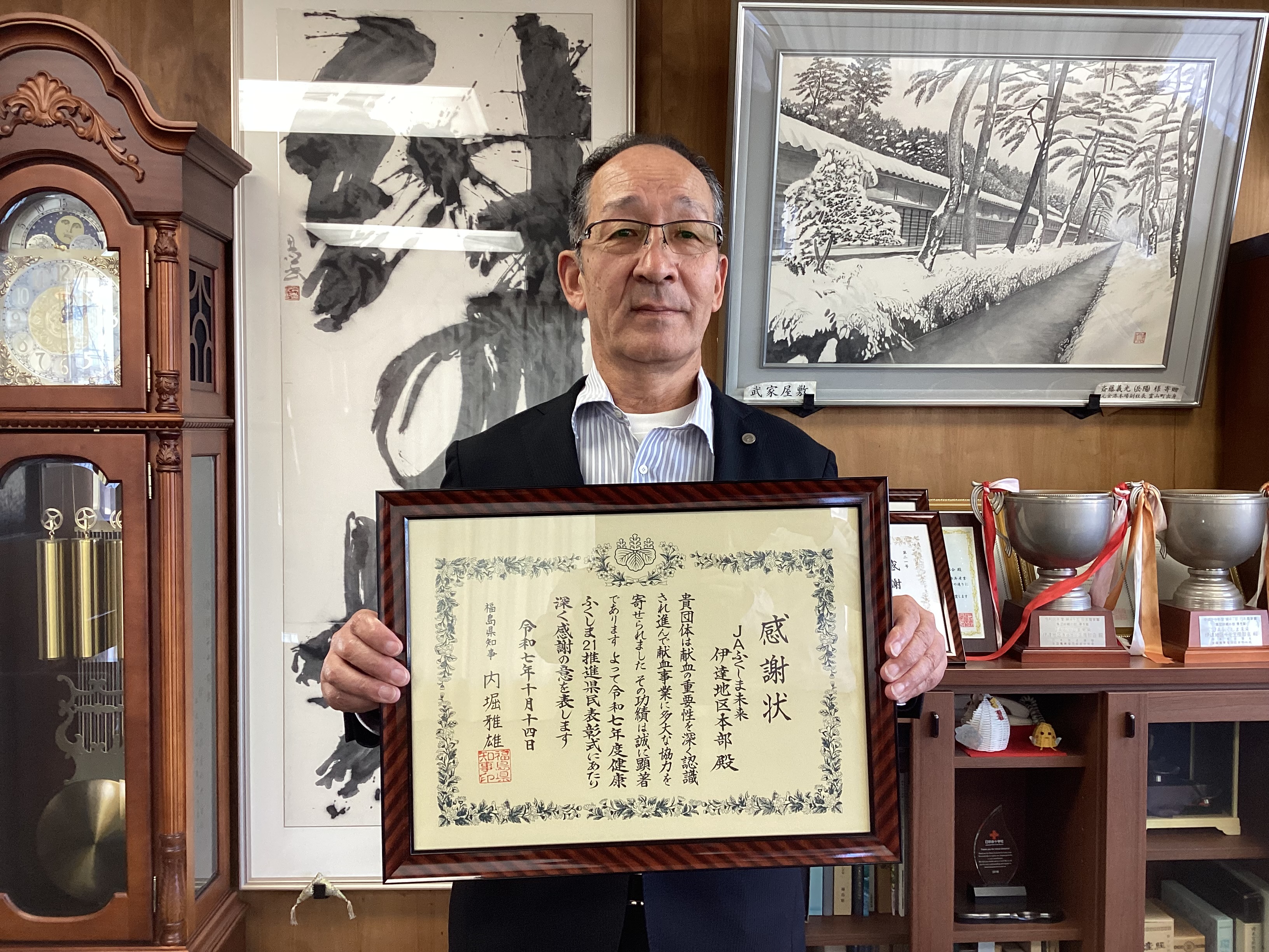 JA伊達地区本部は、長年にわたり献血活動を通じて赤十字事業の発展に貢献してきたことが認められ、このほど日本赤十字社より「福島県知事感謝状」を授与されました。