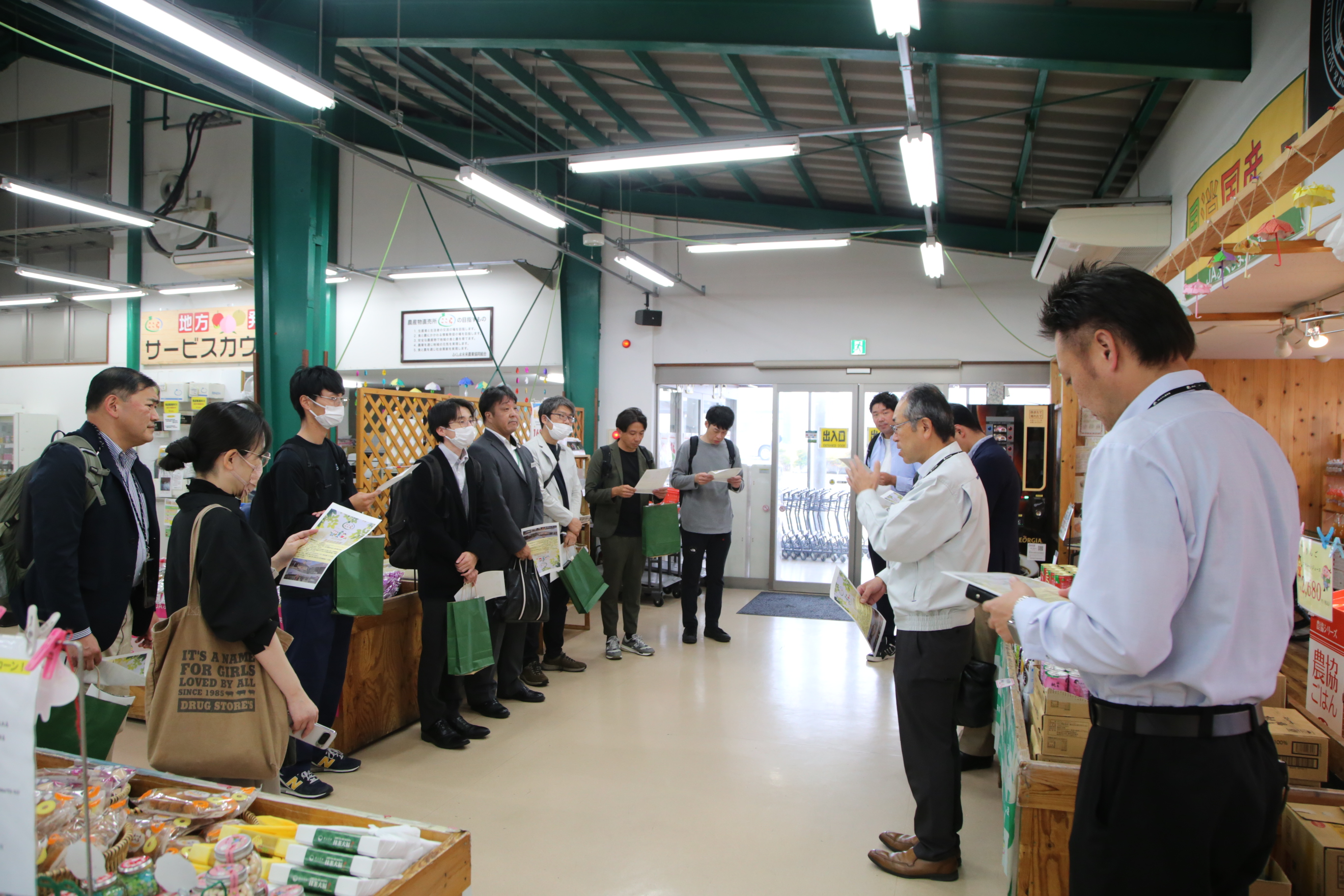 視察では、JA加藤光一常務が「震災からの復興 食と農のユートピア創造へ」と題して組織の概要や現在の取り組み状況について説明し、意見交換も活発に行われました。その後、産直課福島地区の赤井文洋ここら統括店長が農産物直売所の販売状況や、地元農畜産物の販路拡大に向けた工夫などが紹介されました。