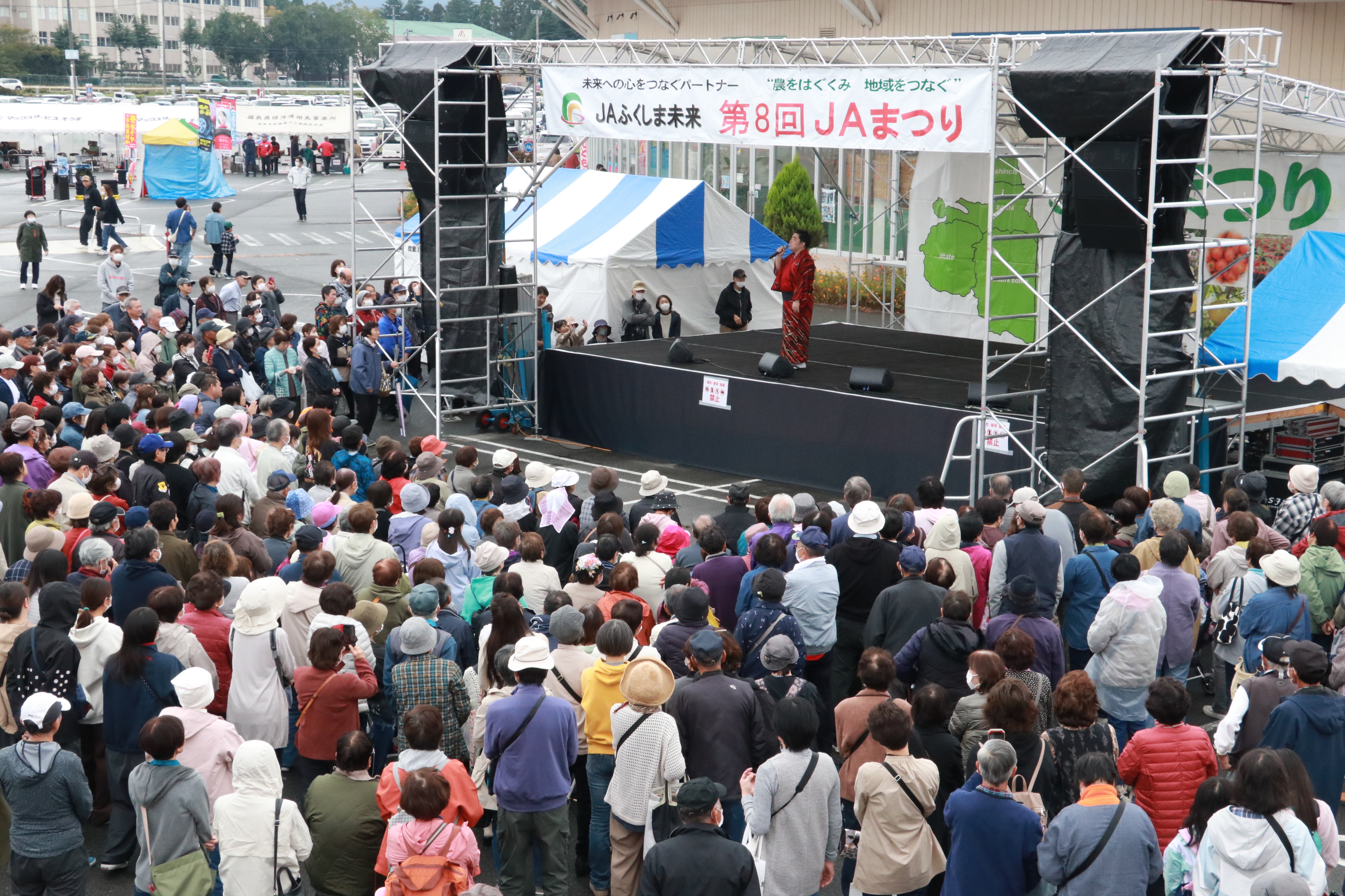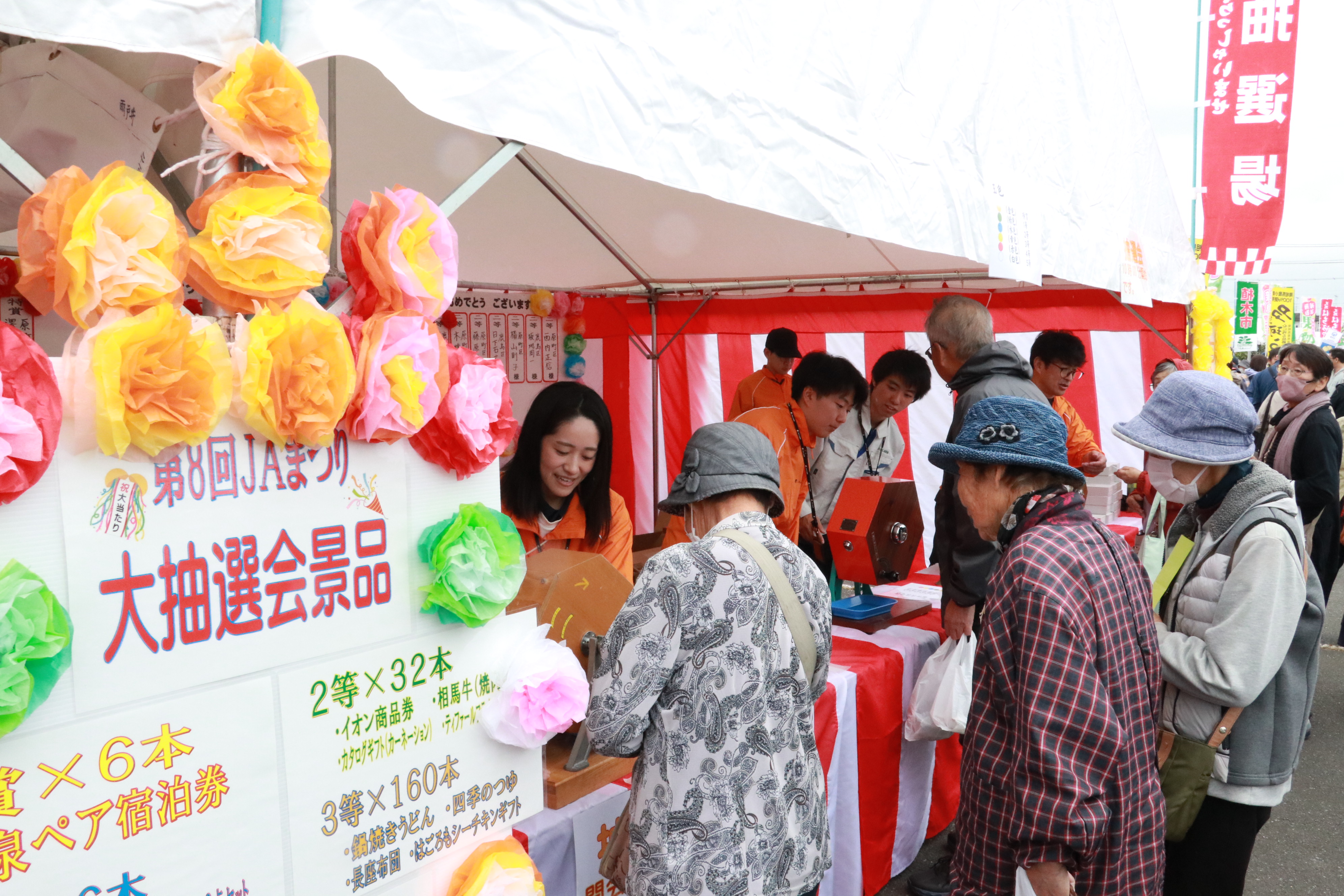 当JAそうま地区は25日から2日間、南相馬市原町区の南相馬ジャスモール特設会場で第8回JAまつりを開きました。国消国産をテーマに地元の特産品の販売や飲食の提供、米販売、高校生による農産物販売、JA職員による屋台販売、大抽選会、キッズランド、投げ餅などを行いました。