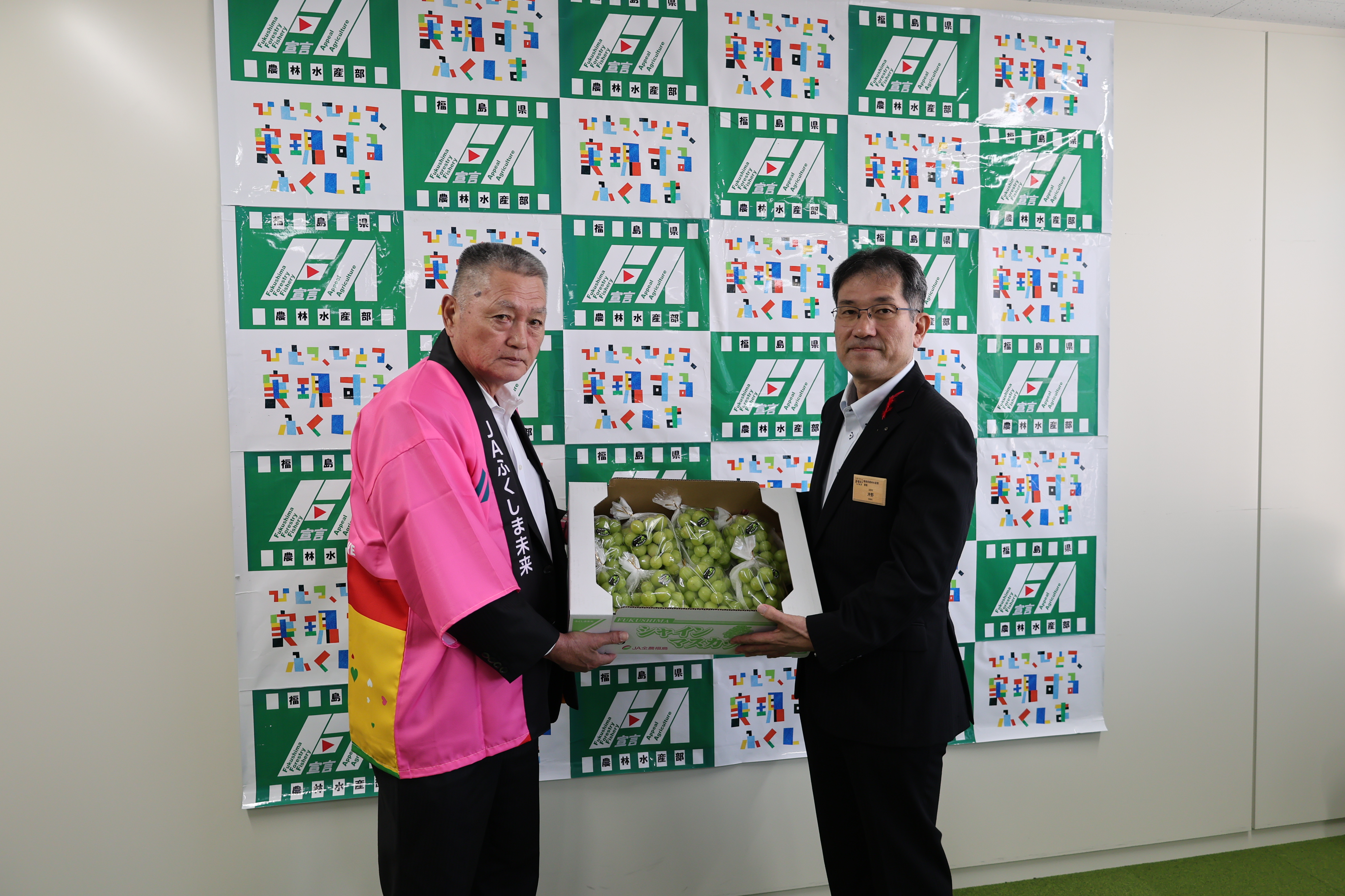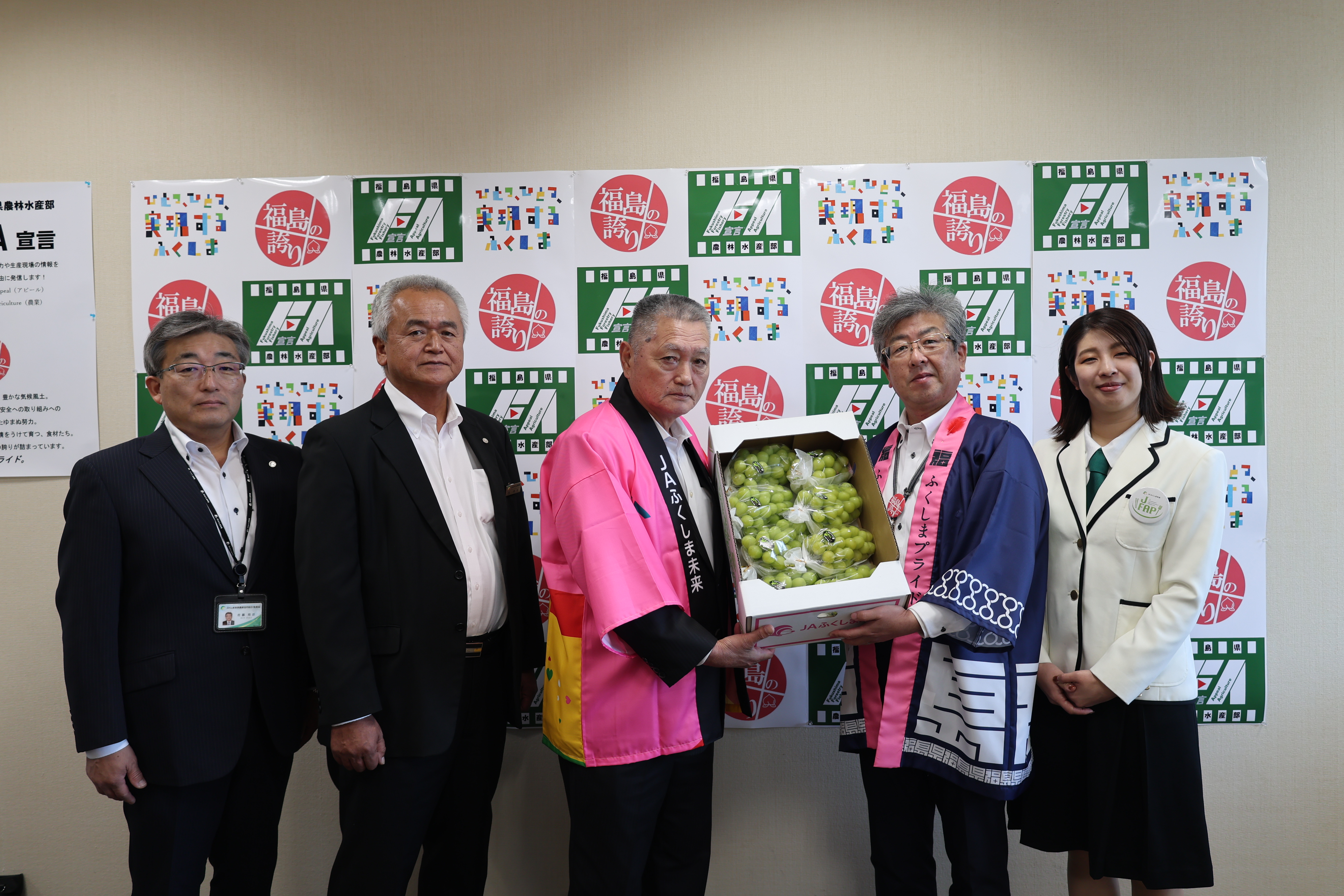 当JAは23日、福島県庁を訪問し、内堀雅雄知事に旬を迎えているブドウ「シャインマスカット」1箱(5㌔8房)を贈り、出来栄えを報告しました。