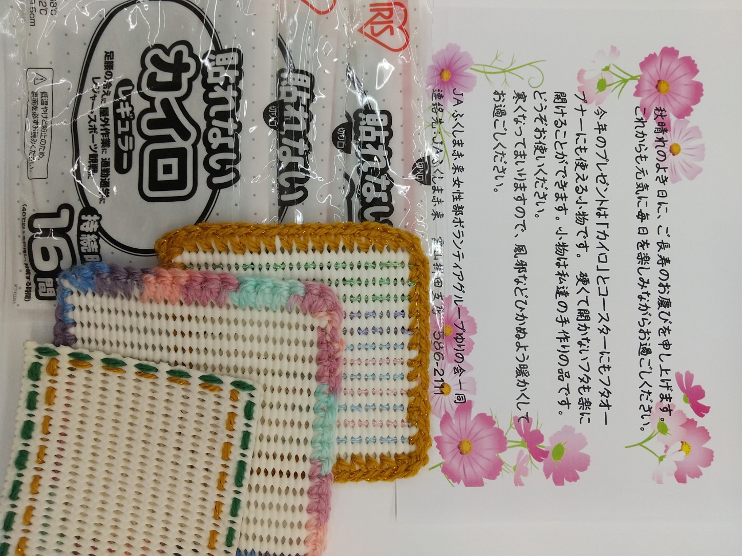 当JA女性部月舘総合支部ボランティアグループゆりの会は27日から31日までの期間、月舘町内の80歳以上の高齢者にプレゼント宅配を実施しています。ゆりの会会員19人が対象者52人の自宅に手分けして訪問し、手紙を添えた使い捨てカイロとコースターを手渡し、安否確認と声掛け運動を行います。コースターは、9月1日の教室開催後、会員が自宅で各自手作りしたもので、すべり止めシートを使用して周りを毛糸で飾り付けており、固い瓶のふたなどのオープナーとしても使うことができます。