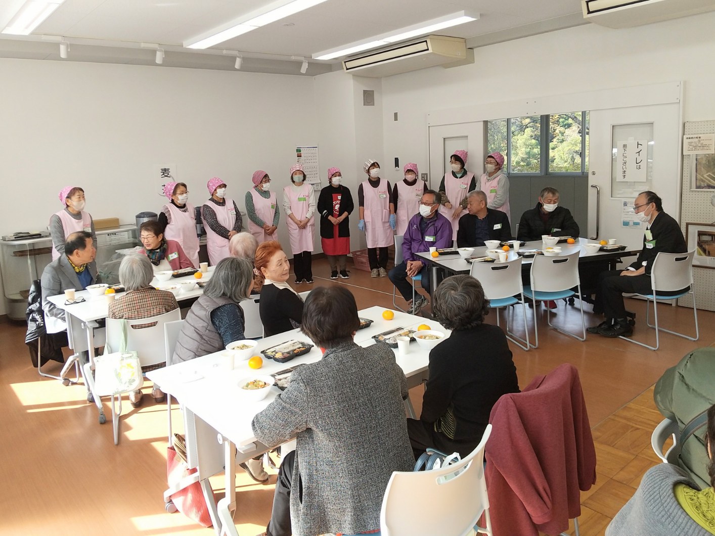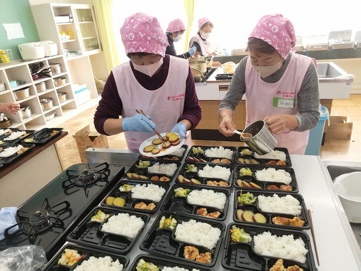 里芋や大根、白菜など秋の味覚をふんだんに入れた「いも煮」や新米を炊いたゆかりご飯、さつまいもの甘煮など80食を調理。ゆりの会の古川恵子会長は「みなさんにおいしいとおかわりもたくさんしていただいた。たくさん食べて元気に過ごしてほしい」と笑顔で話しました。