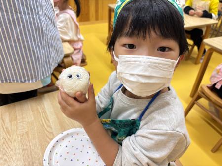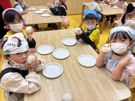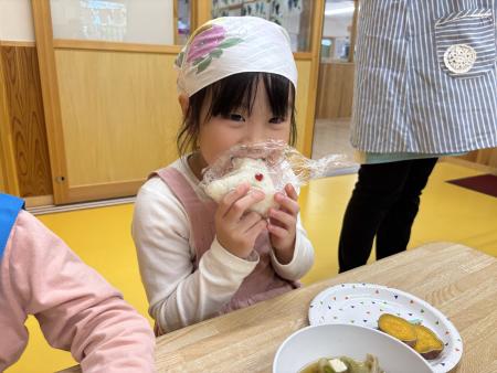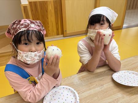 収穫祭では、お米本来の味をしっかり感じてもらおうと、塩おにぎり作りに挑戦。園児たちは「かわいくて食べられない!」と自分で握ったおにぎりを友達と見せ合いながら、笑顔で味わった。参加した園児からは「毎日食べるごはんよりとってもおいしい。自分で育てたお米でおにぎり作れてうれしい」と笑顔で話した。
