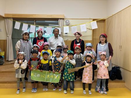「おこめっこ大作戦!」は、今年度から始まった食育事業。子どもたちが田植えから稲刈り、脱穀、そして調理までを体験することで、食と農の大切さや楽しさを学ぶことを目的としている。今回は、前回の活動で脱穀後に残った稲を使い、園児たちが手作りのほうきを作成し、記念品として持ち帰った。
