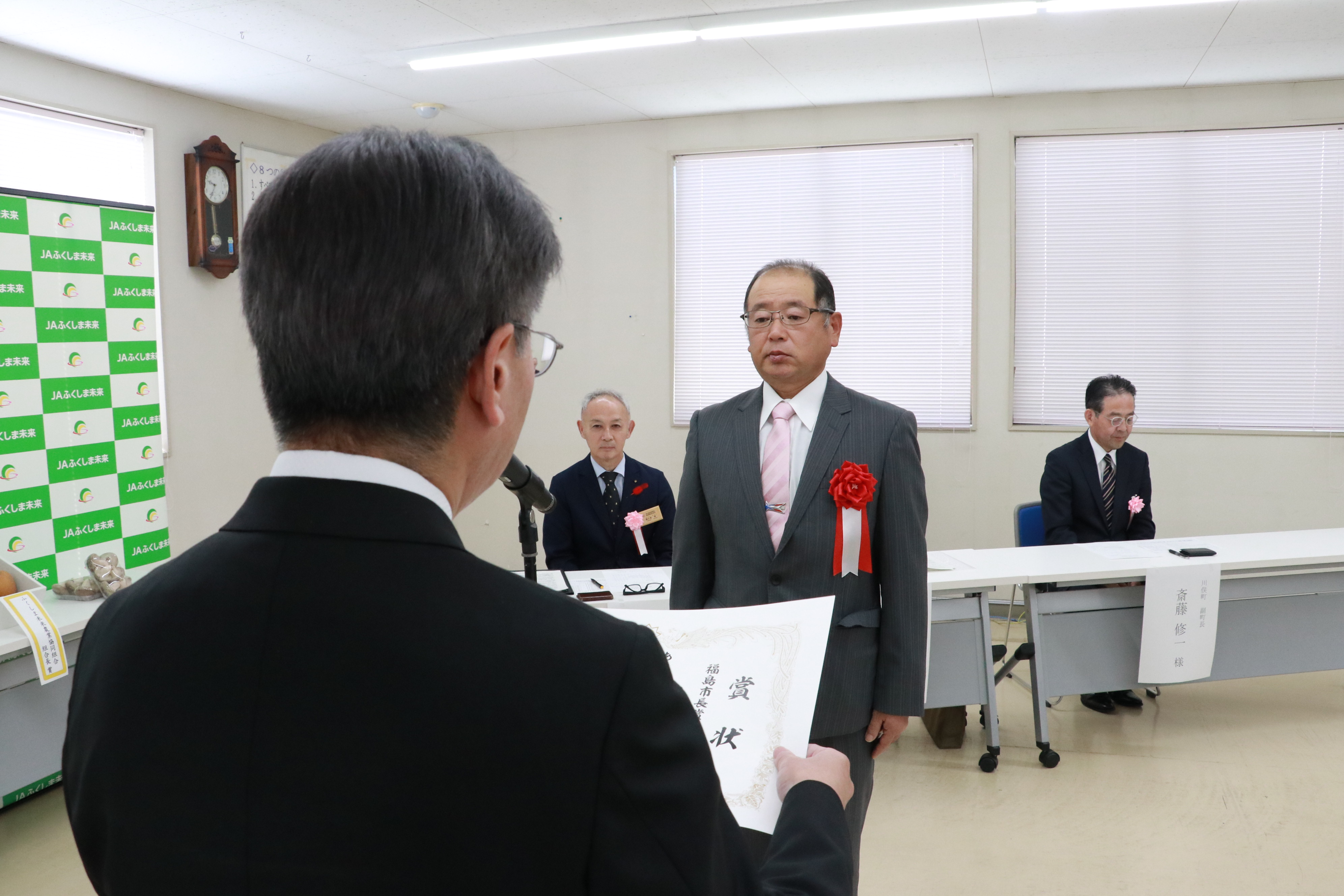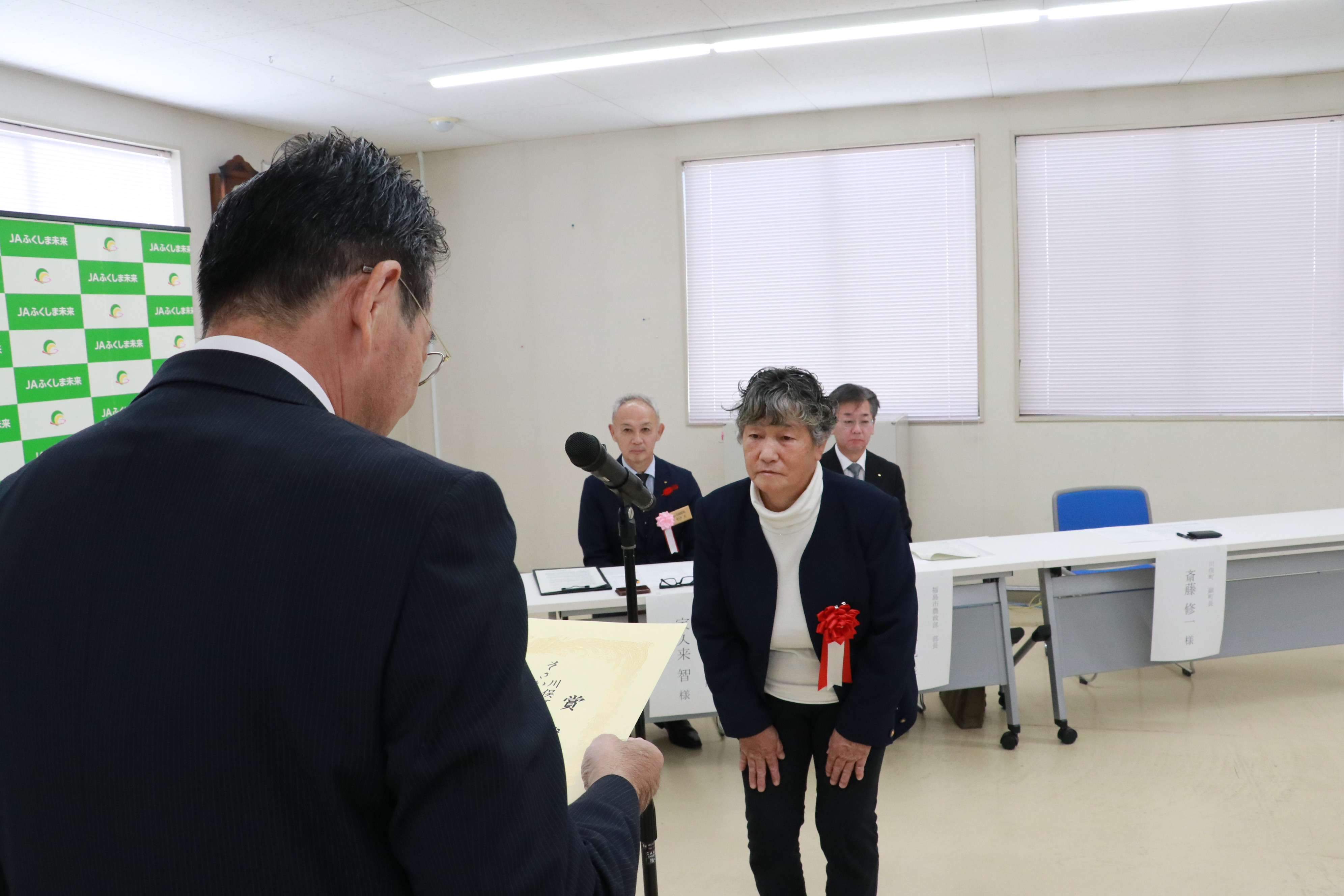 表彰式では、県知事賞果実の部高澤雄生さん(サンふじ)、福島市長賞そさいの部大槻晃宏さん(キュウリ)、花卉の部島貫徳和さん(ダリア)、川俣町長賞そさいの部高橋孝子さん(ミニトマト)らが輝きました。