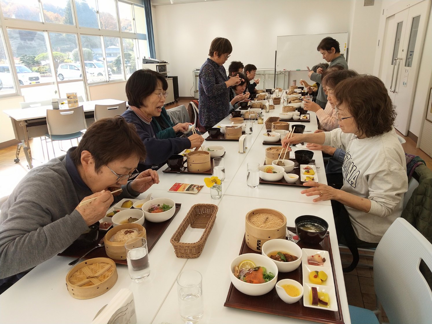 体操終了後は、これまで行ってきたプレゼント宅配や調理ボランティアなどの活動報告・検討を行い、参加者は「きてみ~なカフェ」のランチを味わいながら交流を深めました。