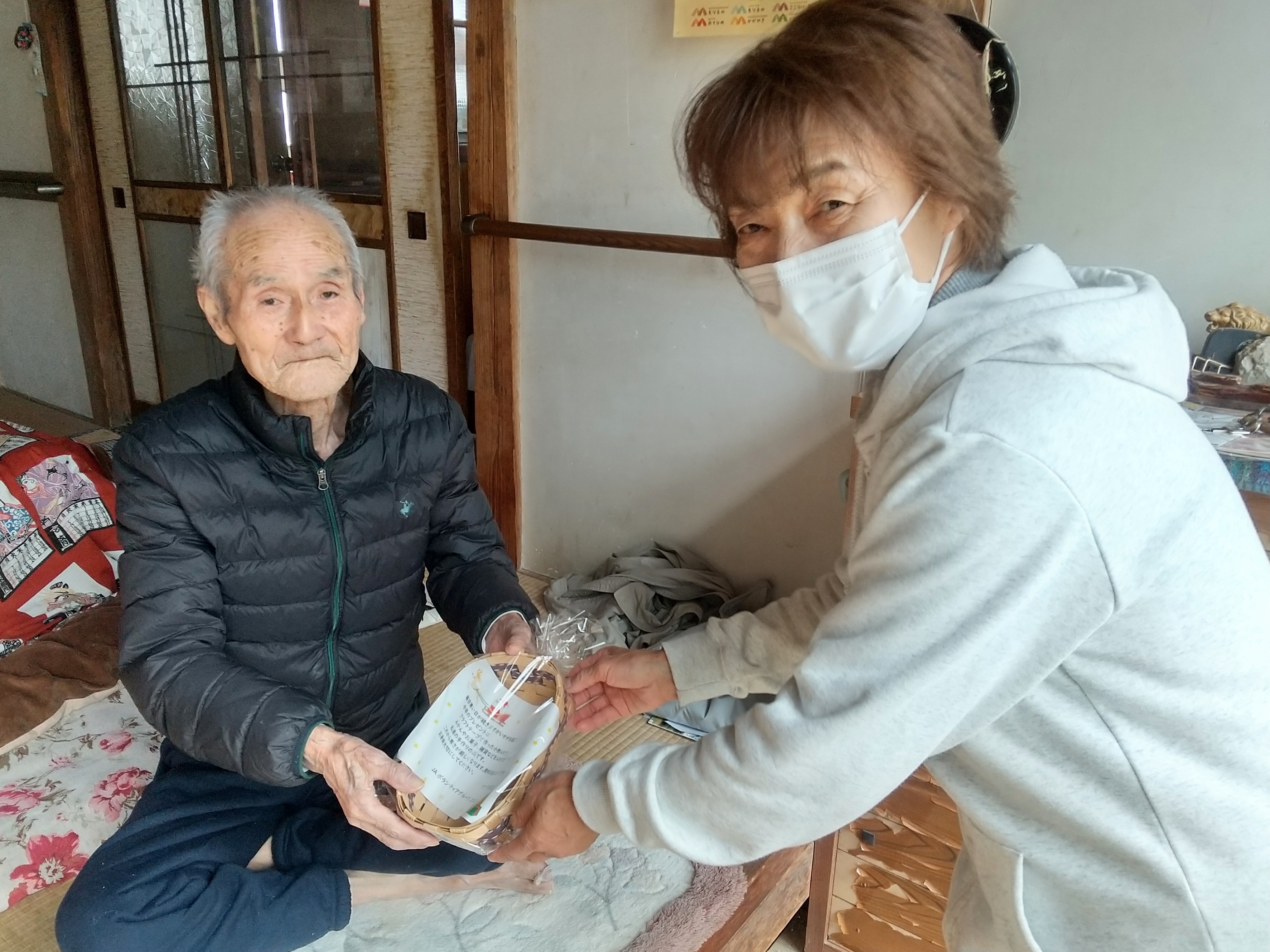 8日には、よつば会代表の直江いち子さんがプレゼントを手に高齢者宅を訪問。「変わりないですか?寒くなってきたので暖かくして過ごしてくださいね」と声をかけました。プレゼントはよつば会会員のほか、JA職員も協力して霊山町内の対象者52名へ届けられる予定です。