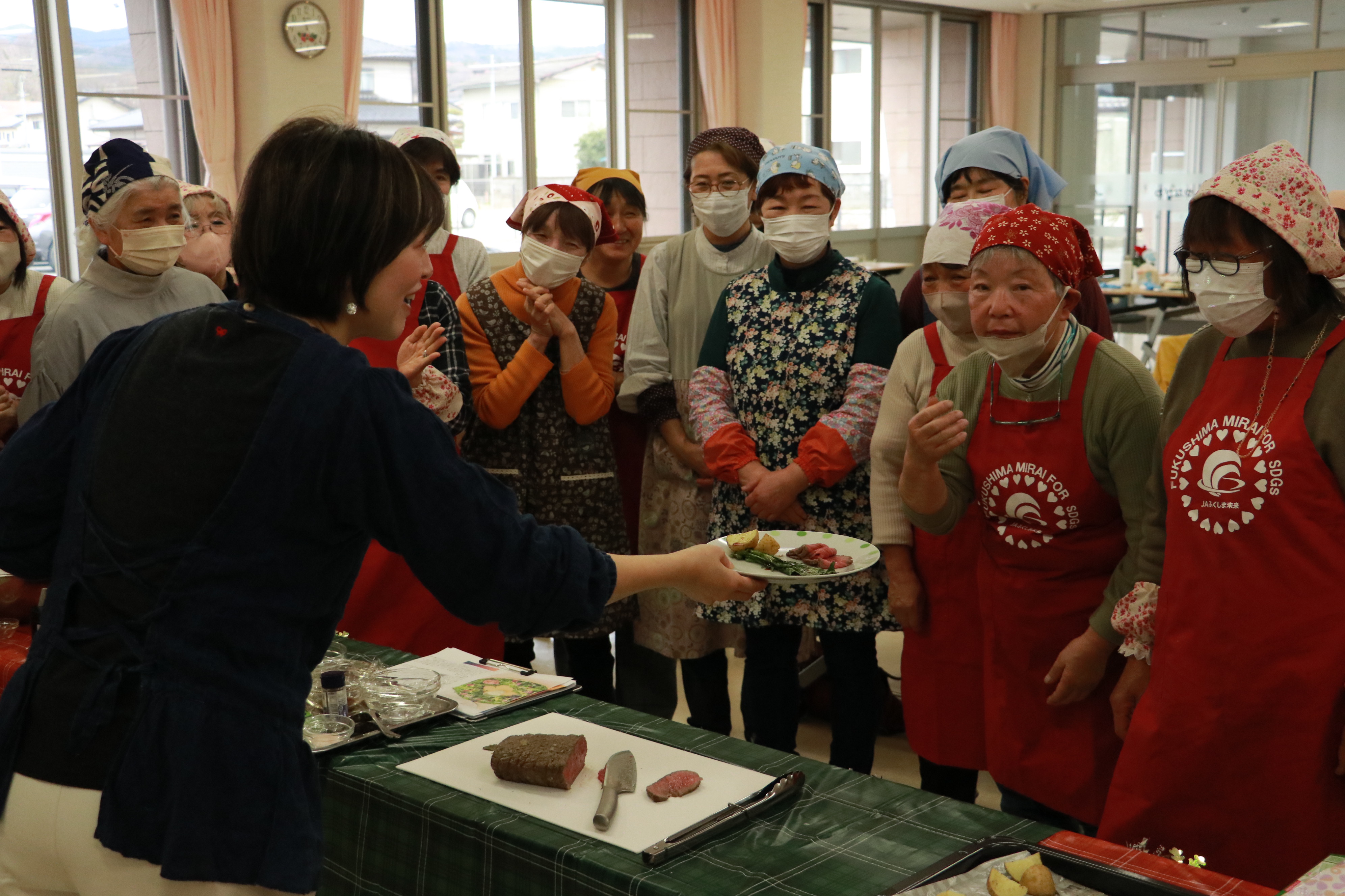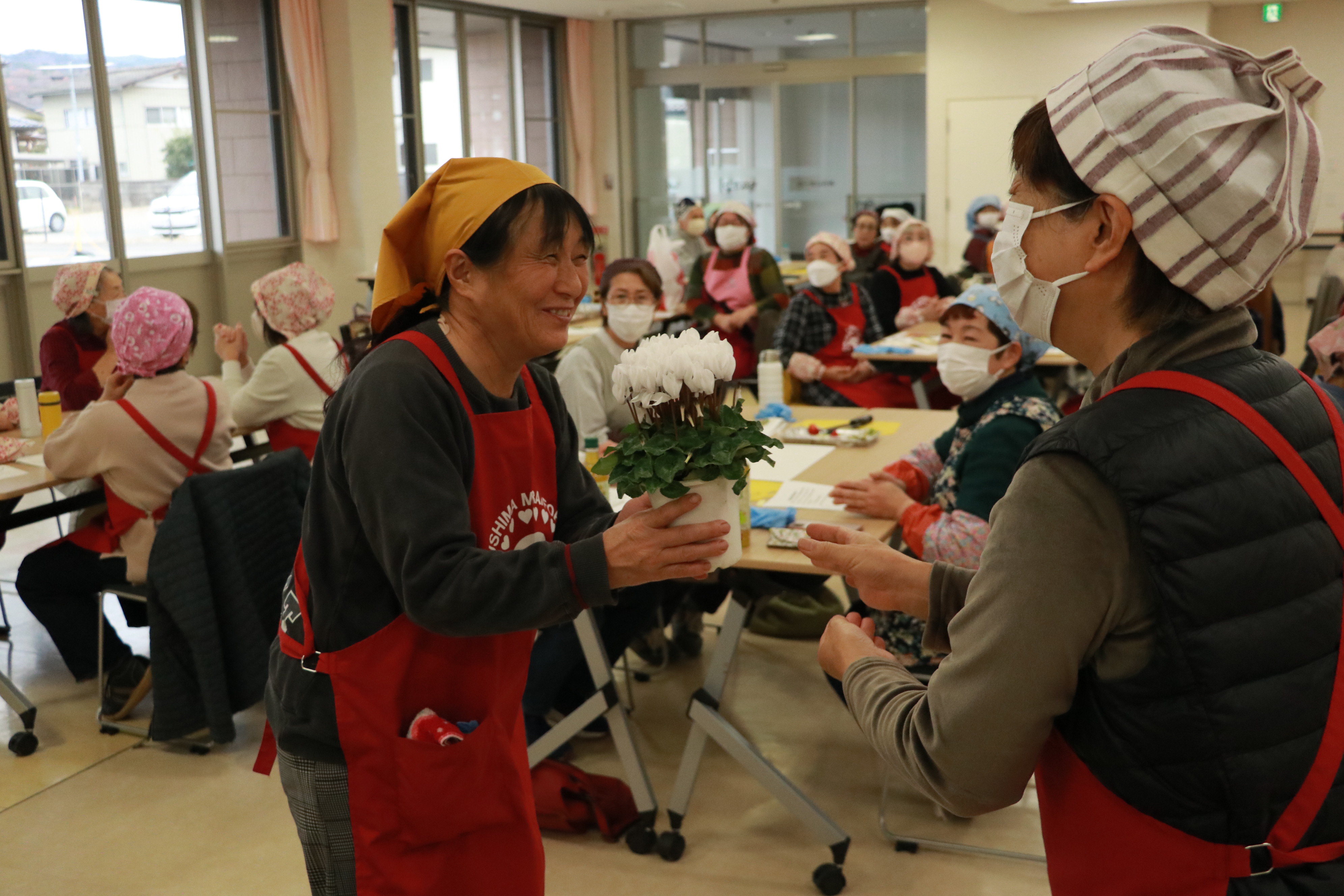 当JA伊達地区本部は3日、伊達市梁川町のみらいホールやながわで女性講座「みらいスクール」の第6回講座「クリスマス料理講座」と閉講式を行いました。午前、午後あわせて63人が参加し、閉講式では6回講座すべてに参加した受講者に色鮮やかなシクラメンを贈り次年度の参加を呼び掛けました。