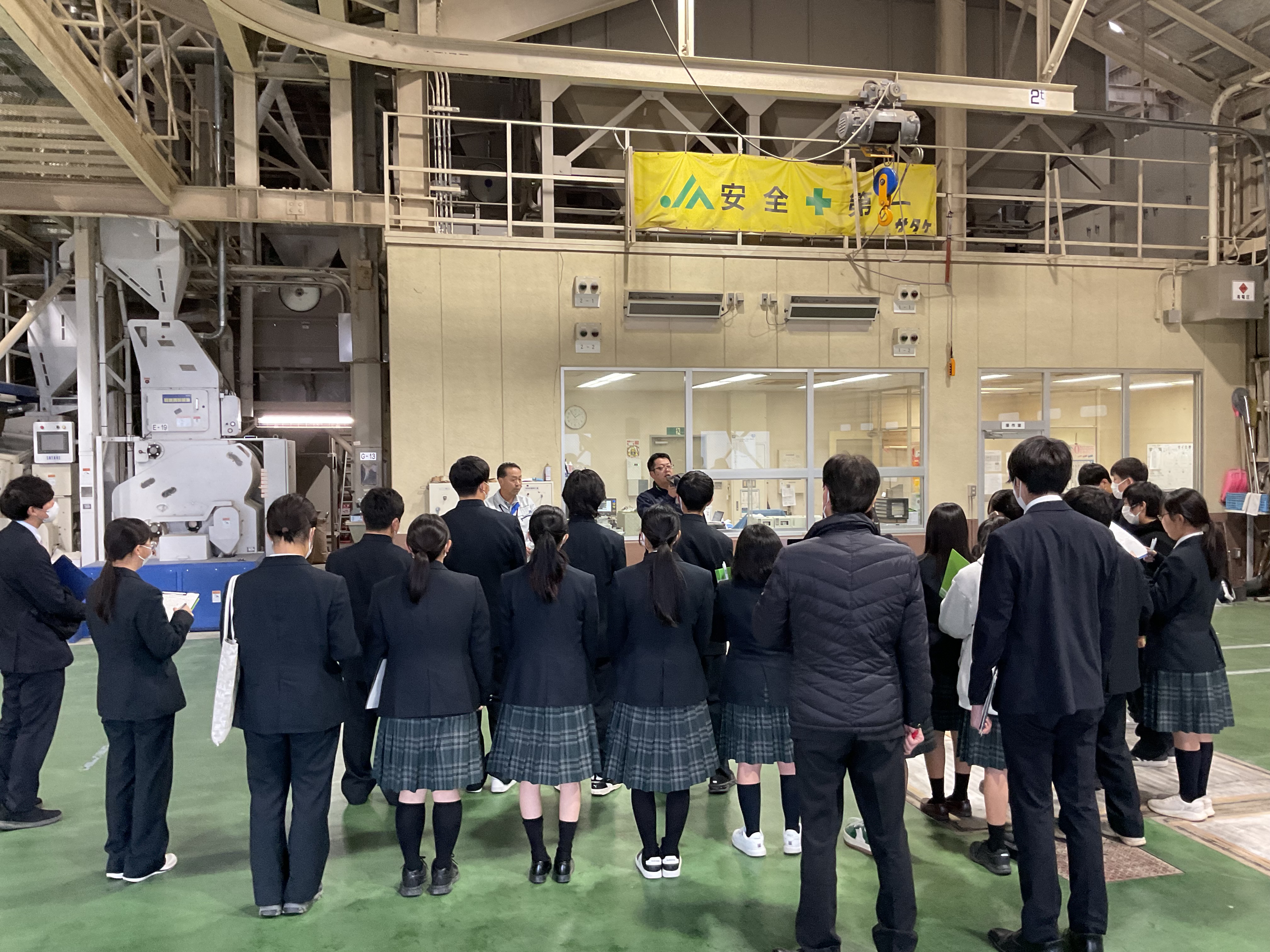 令和7年12月3日に相馬農業高等学校の1年生20名が、そうま地区本部の事業所見学を行いました。見学では、事業内容の説明を受けた後、鹿島カントリーエレベーターや配送センターテント倉庫を訪問。鹿島営農センターの門馬主任による施設案内のもと、地域農業の現場や物流の仕組みについて学びました。生徒たちは、施設の規模や肥料の種類の多さに驚き、ふくしまの未来を考える貴重な機会となりました。