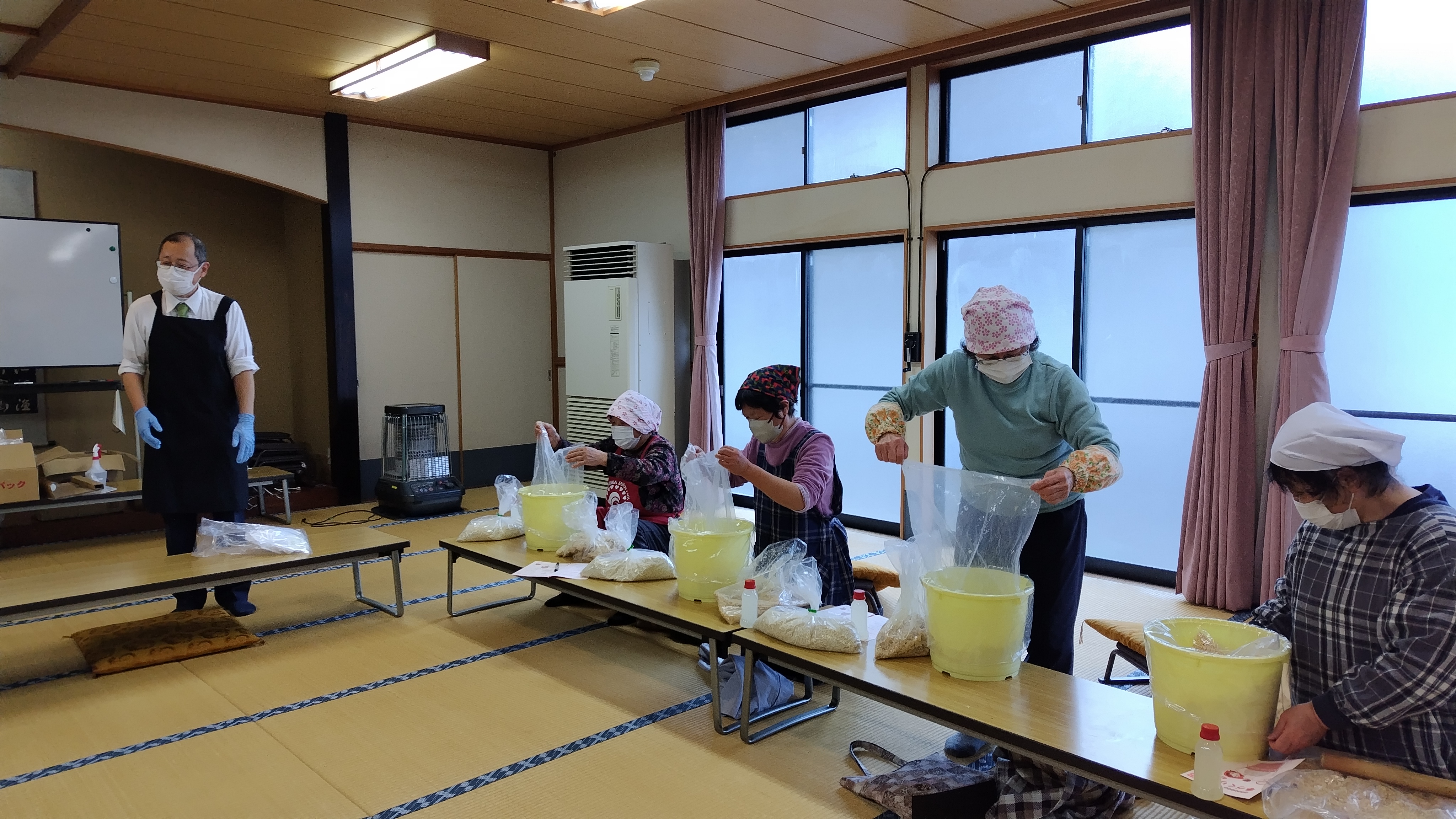 当JA女性部堰本支部は11日、内池醸造の桜庭智明さんを講師に招き、みそ作り教室を開きました。蒸した大豆を手でつぶし、「おいしくな~れ」と願いを込めながら麹と塩を加え混ぜ合わせました。