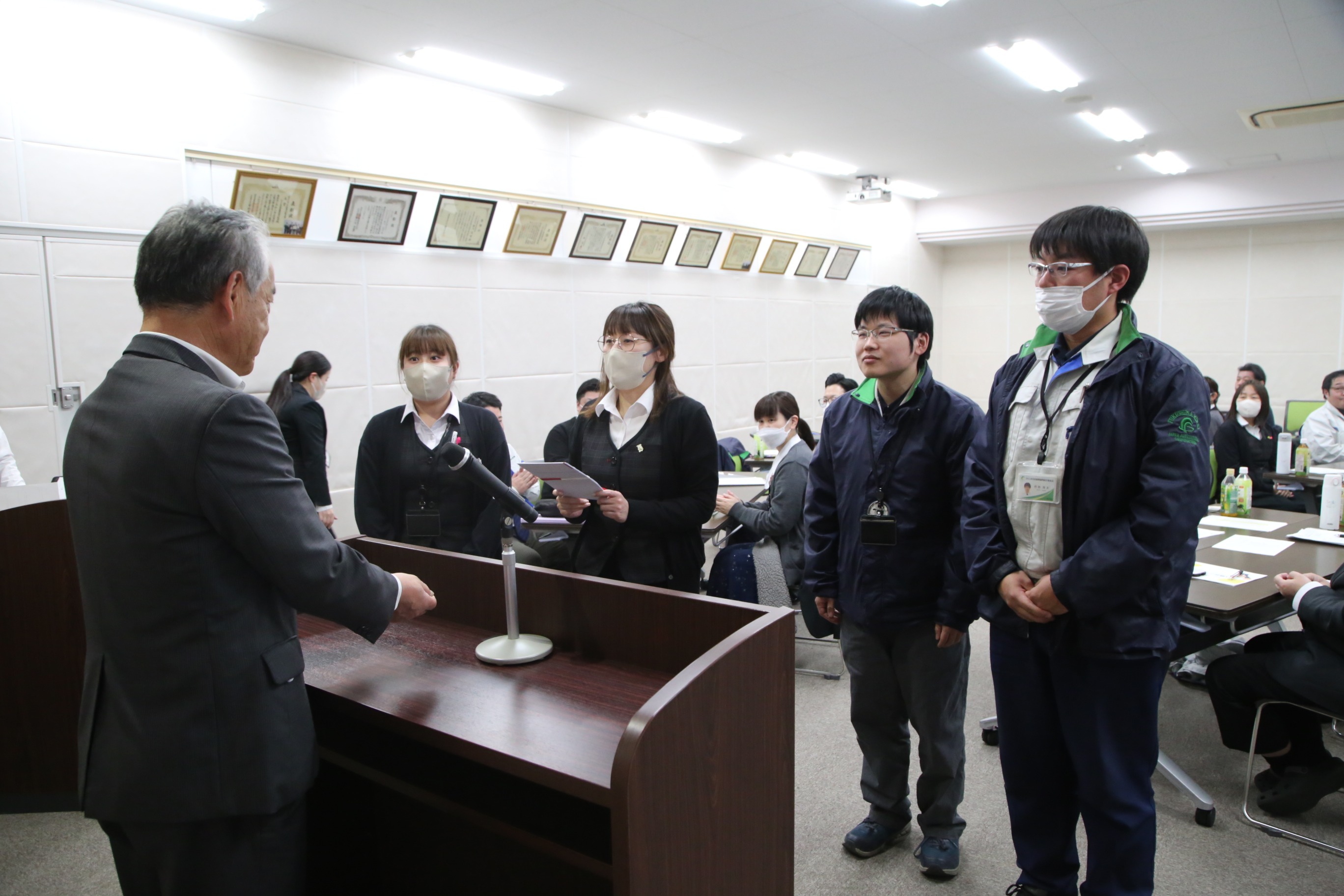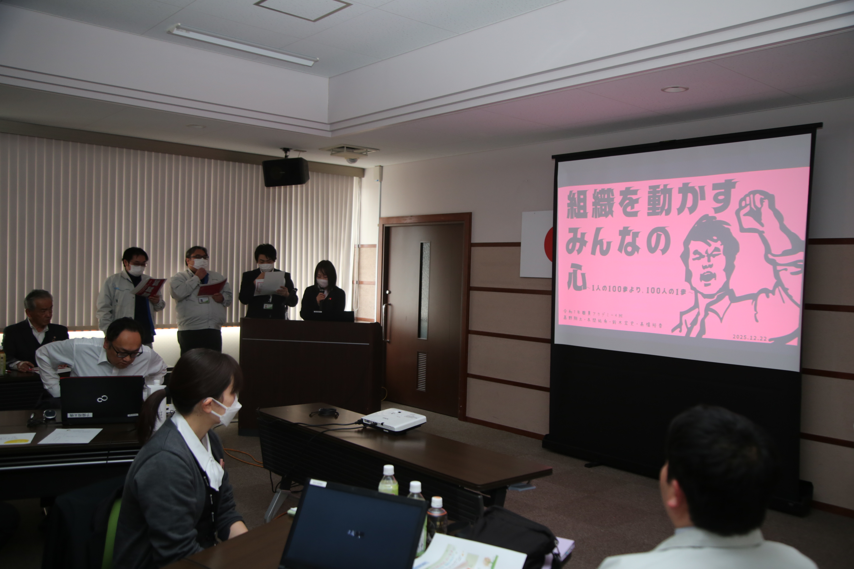 本年度は「職員のやる気スイッチ」と題し、エンゲージメント指数を上げる施策をテーマに、21人の職員が参加。22日に行われた第4回職員アカデミーで、5グループに分かれて発表を行いました。最優秀賞には「職員ES(従業員満足度)向上へのチャレンジ 職員のやる気スイッチをONにしよう」と題したプレゼンが選ばれました。中堅職員の退職者増や人手不足といった課題に対し、業務の見える化や地区を越えた交流、細やかな面談の実施など、職員の孤独感や不安を軽減し、挑戦しやすい職場環境づくりを提案しました。