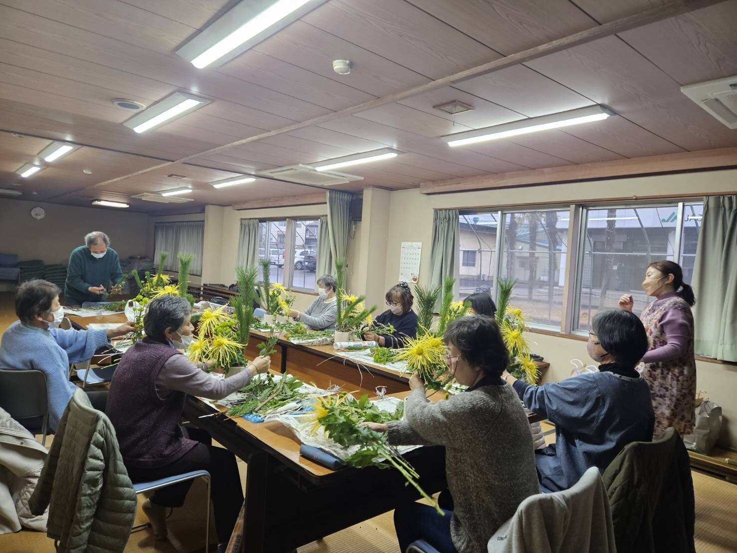 当JA女性部桑折総合支部は25日、桑折町でお正月用のフラワーアレンジメント教室を開きました。霊山町の花の店伊東から講師を招き、部員9人が参加しました。松や糸菊、南天などお正月らしい色とりどりの花材を使い、新年への願いを込めてアレンジメントを楽しみました。参加者は「良い新年が迎えられそう」と話しました。