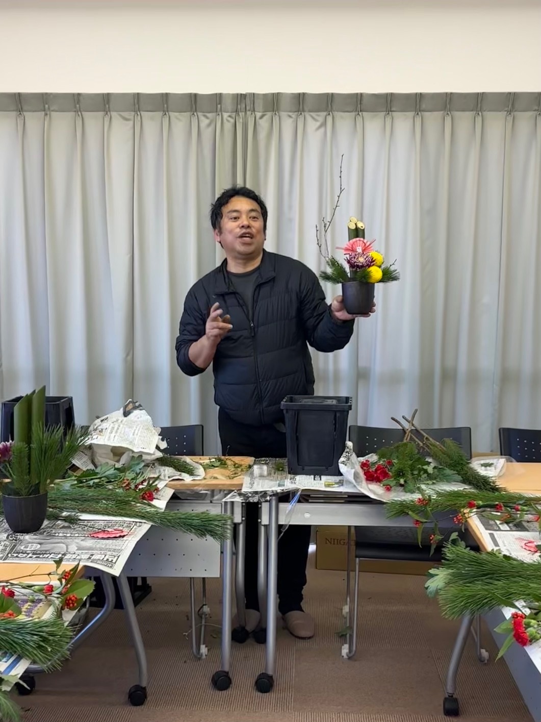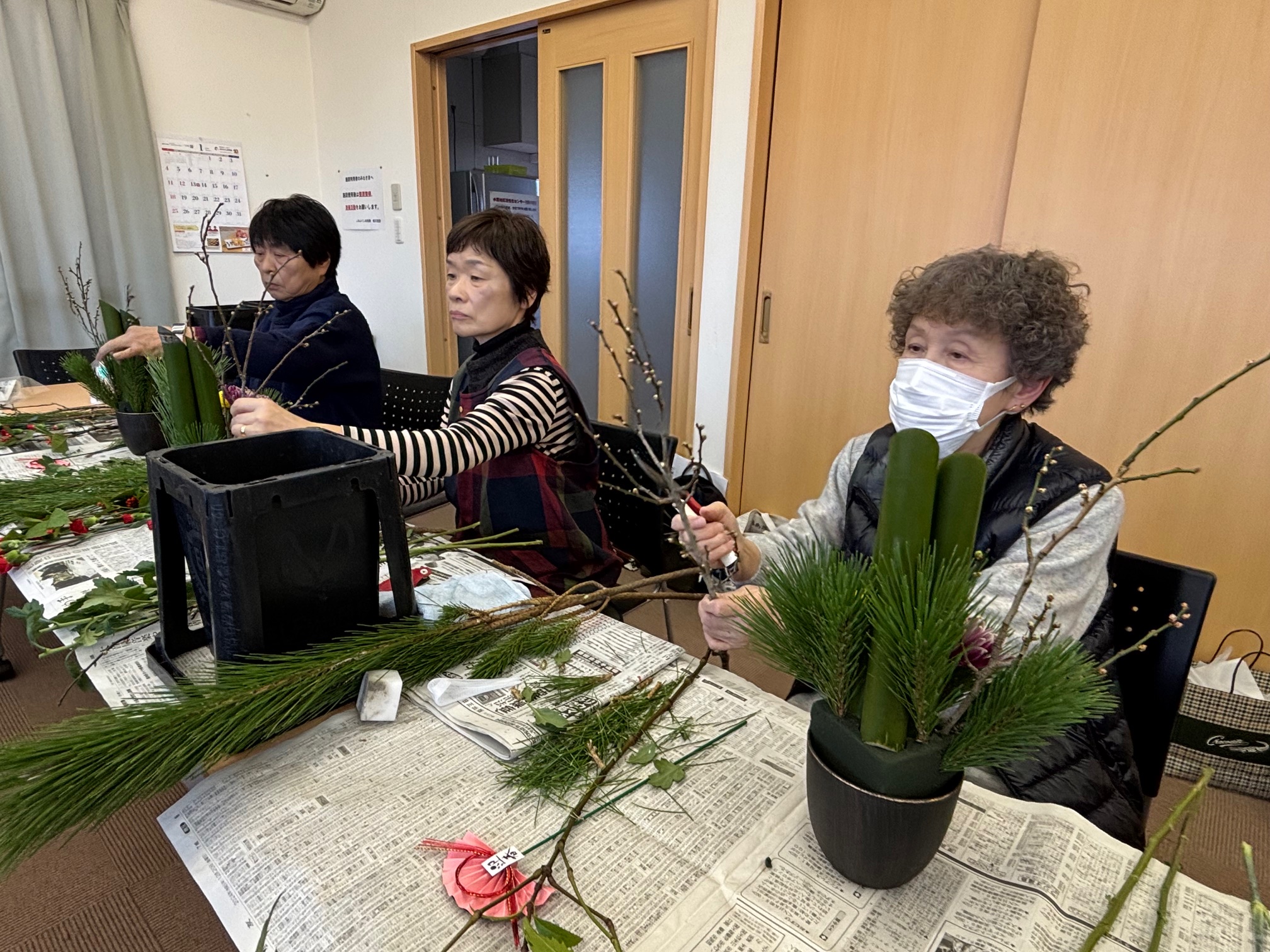 二本松の生花店「花のチカミ」の近見豪人さんを講師に迎え、部員11人が思い思いのミニ門松を作りました。加藤明美支部長は「良いお正月が向かえられるよう素敵な作品を作りましょう」とあいさつしました。参加者は門松を作りながら、松竹梅が縁起が良いといわれている理由や使用したマム(菊)の栽培方法を学びました。