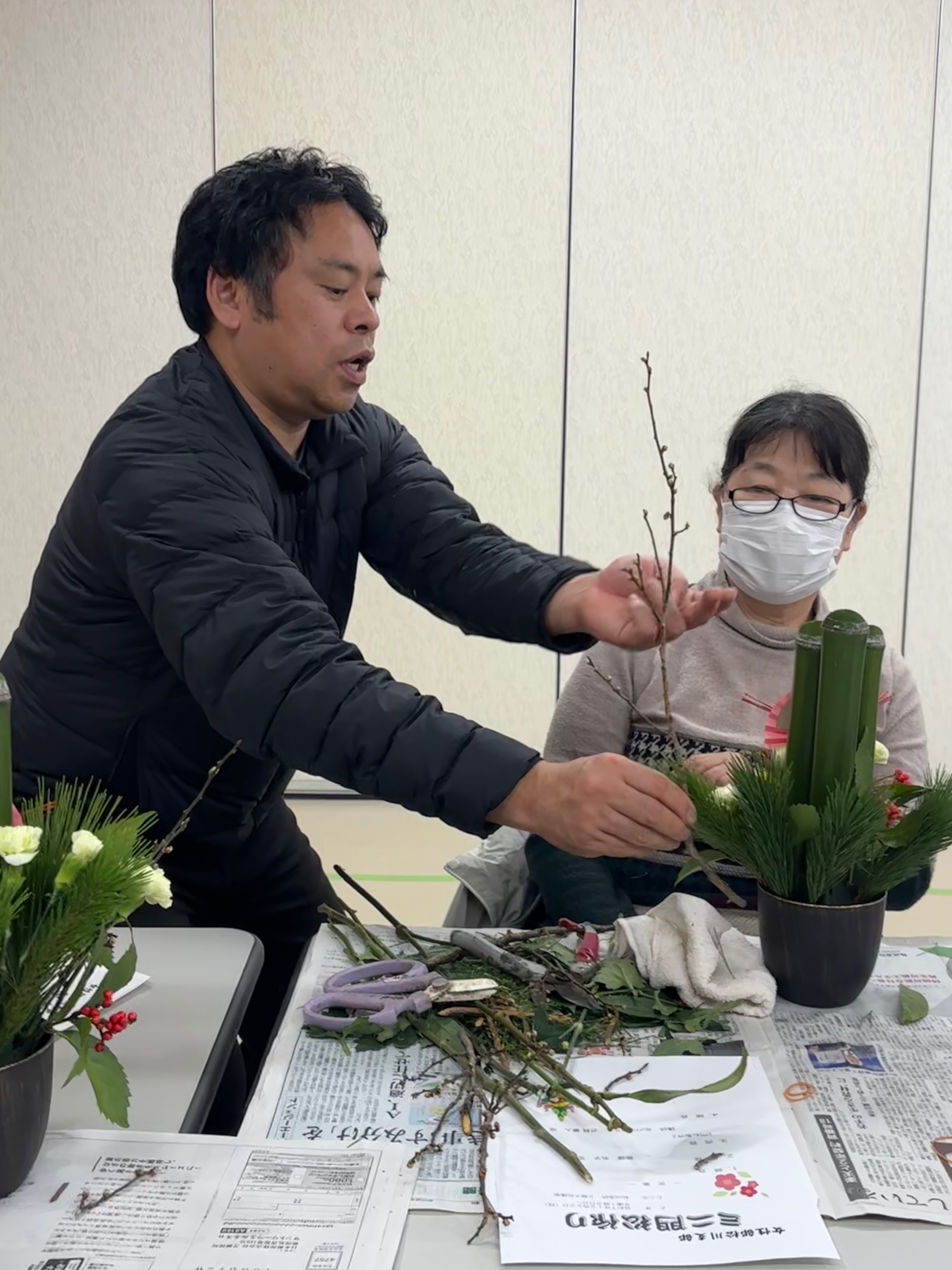 当JA女性部松川支部は22日、花のチカミの近見豪人さんを講師に招きミニ門松を作りました。松竹梅やディスバットマム、千両やカーネーションを花材として使い制作。松川支部では「笑い竹を使いたい」という要望もあり、作品に取り入れました。参加者は、松は神様の依代で、その後は鏡餅に鎮座し木槌でたたいて割った餅のかけらをお年玉としてこどもに配り無病息災を願ったことなどを学びました。近見さんのアドバイスも踏まえながら、オリジナルの門松を完成させました。参加した部員は「かわいらしいサイズで玄関に飾るのにぴったり。これで神様も来てくれる」と笑顔を見せました。