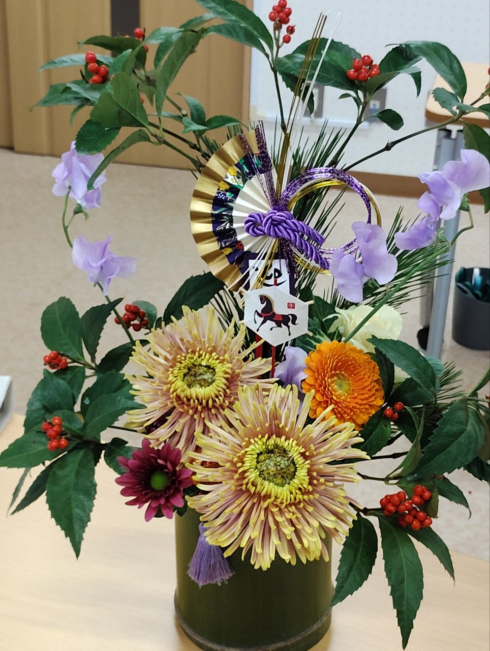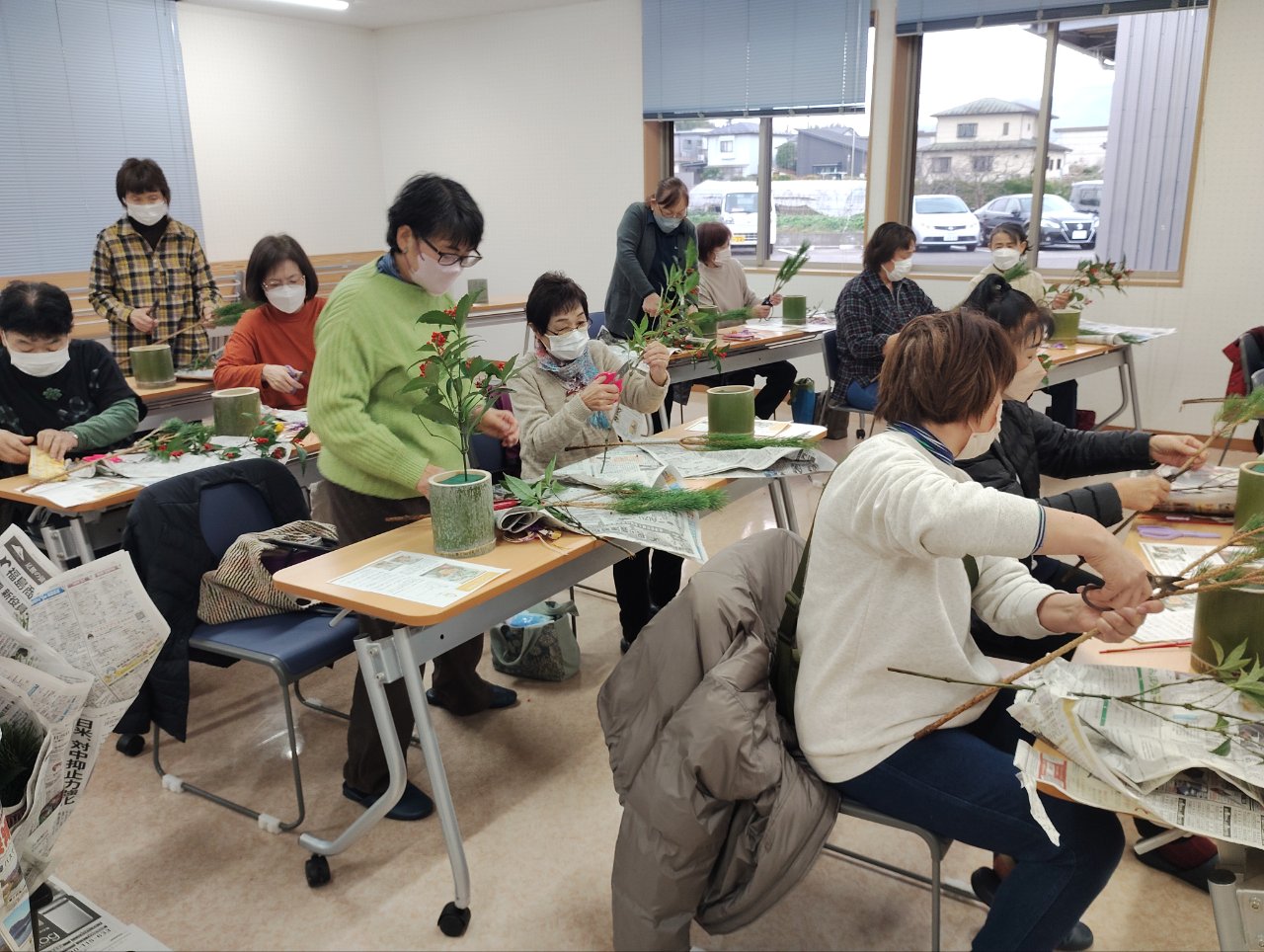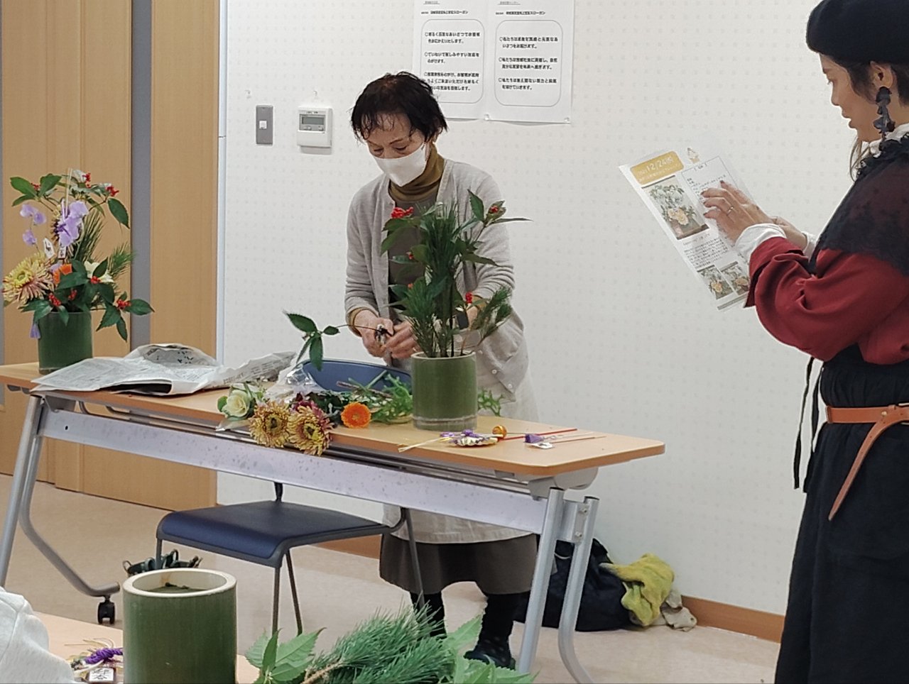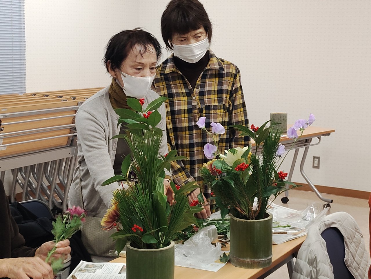 講師に相馬市・池田生花店の池田久美子さんを招き、部員21人が日持ちするお正月用フラワーアレンジメントを学びました。講師の見本を見ながら花を生け、最後に手直ししてもらったり評価してもらったりしながら個性あふれる作品を完成させました。