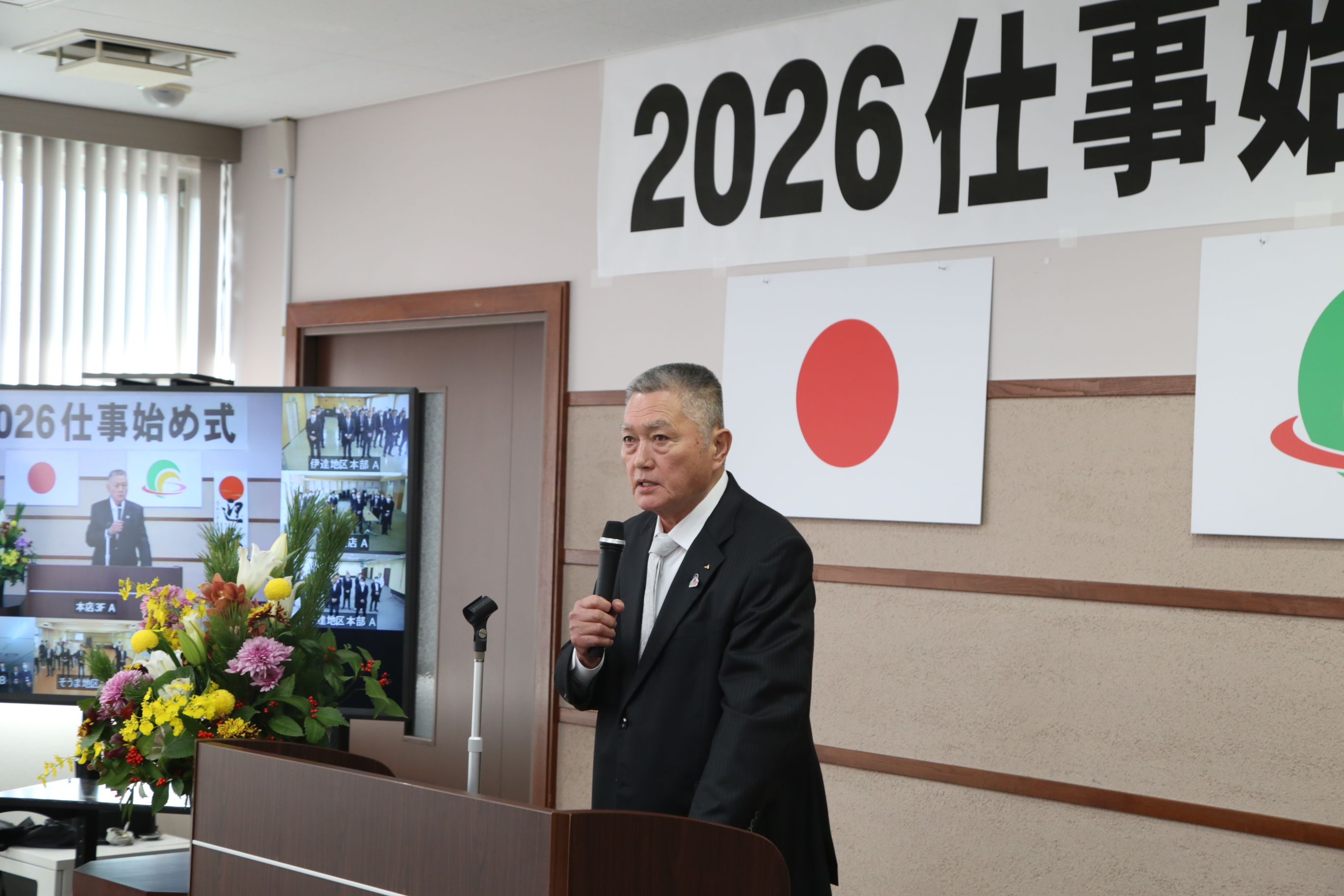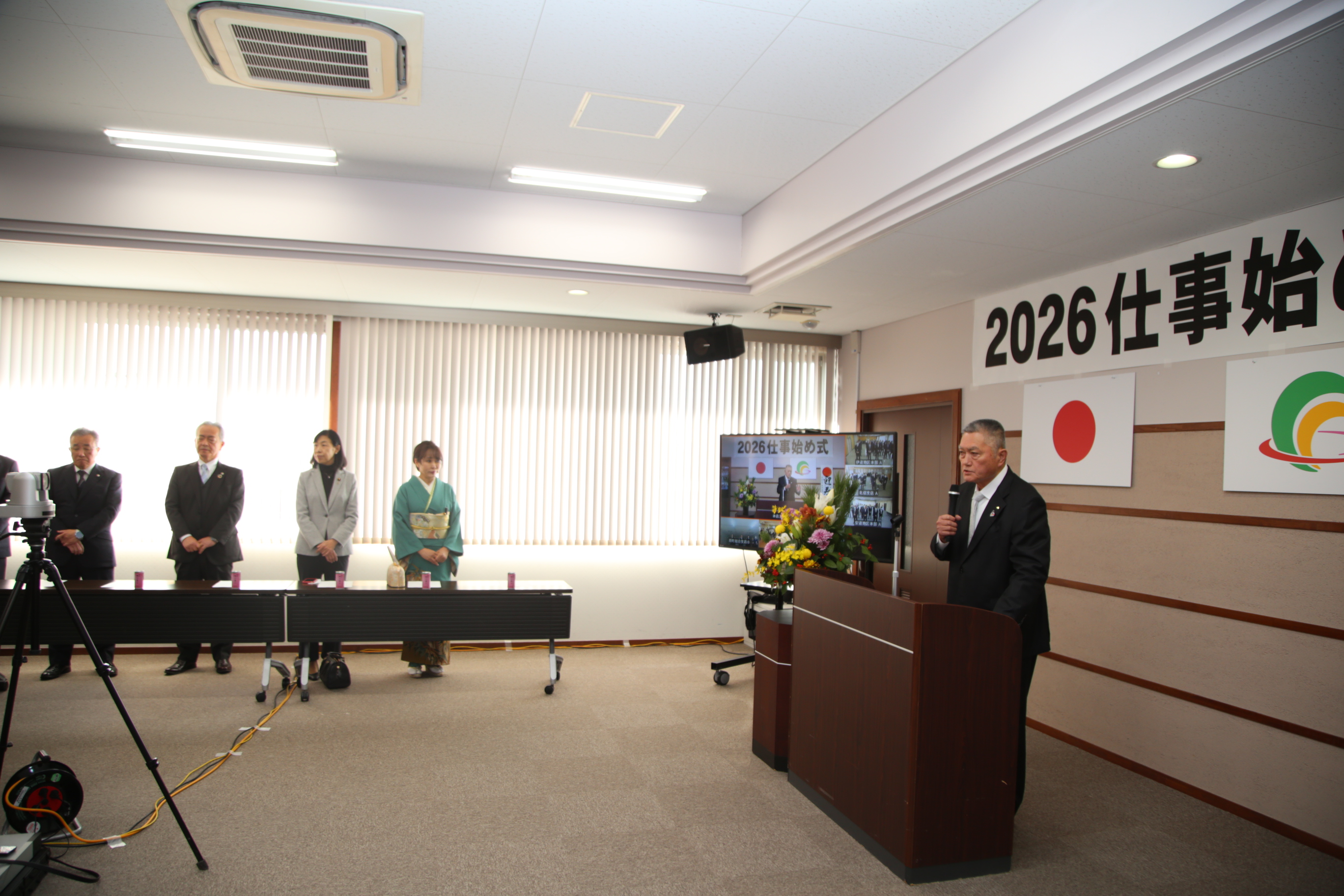 当JAは5日、福島市の本店で2026年仕事始め式を開きました。管内計6カ所をウェブ会議でつなぎ、役職員ら約200人が出席しました。