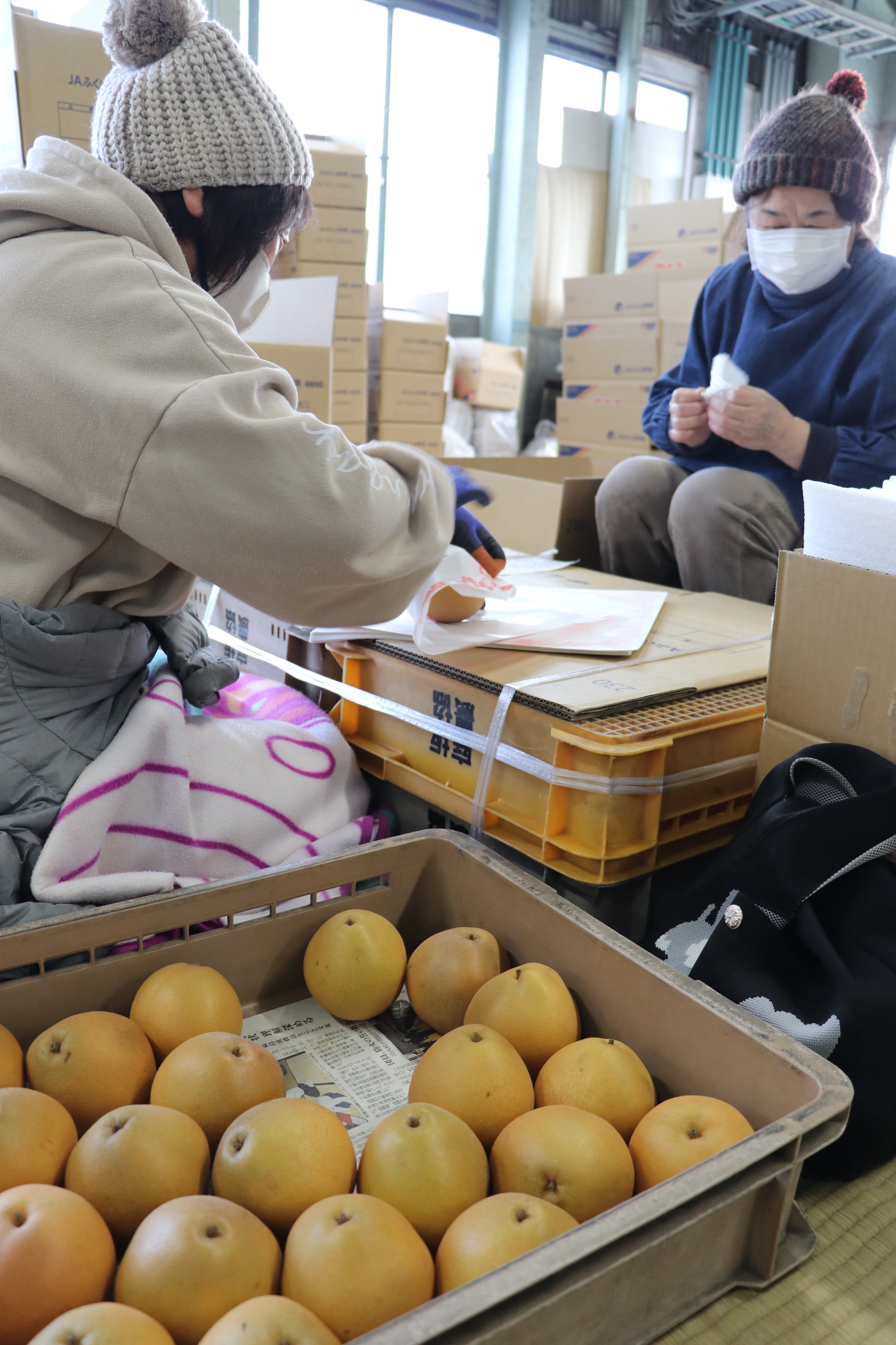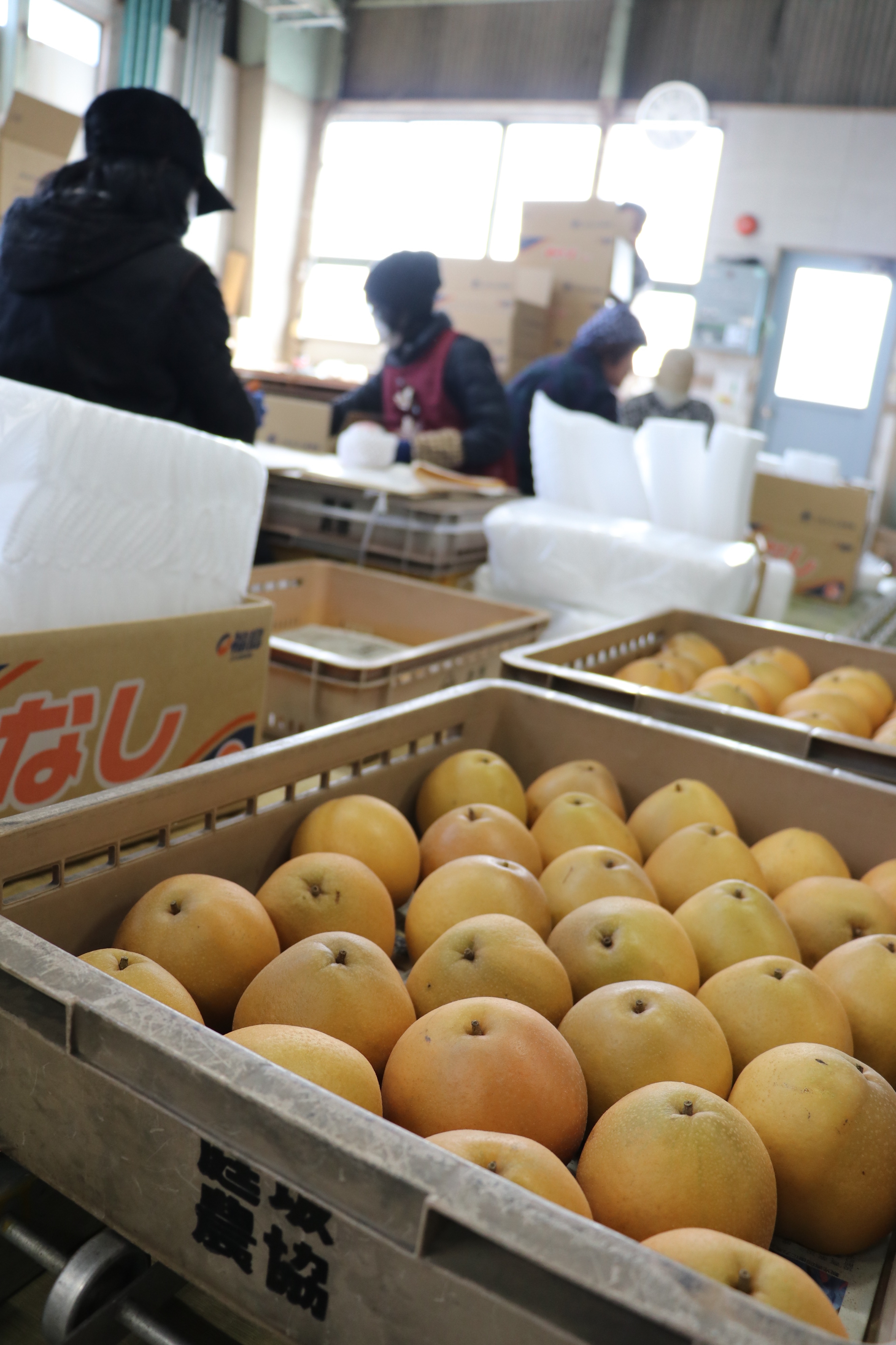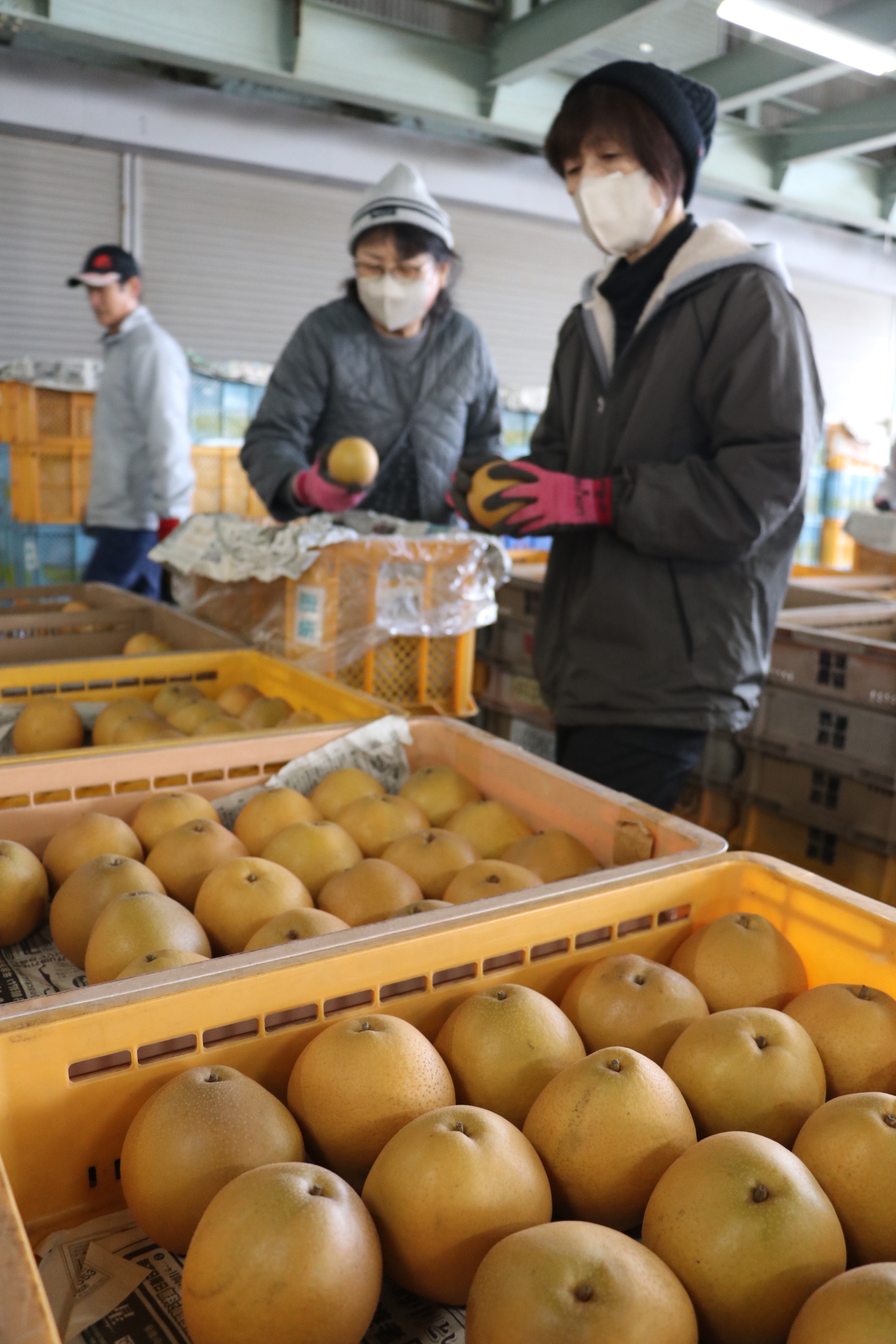 同共選場に持ち込まれた晩三吉は、外観や重さを選別計測し、一つ一つ丁寧に手作業で紙に包み、箱詰めし出荷します。JA担当者は「甘味と酸味のバランスが良く仕上がった。冬の梨をぜひ多くの消費者に味わってほしい」と話しました。