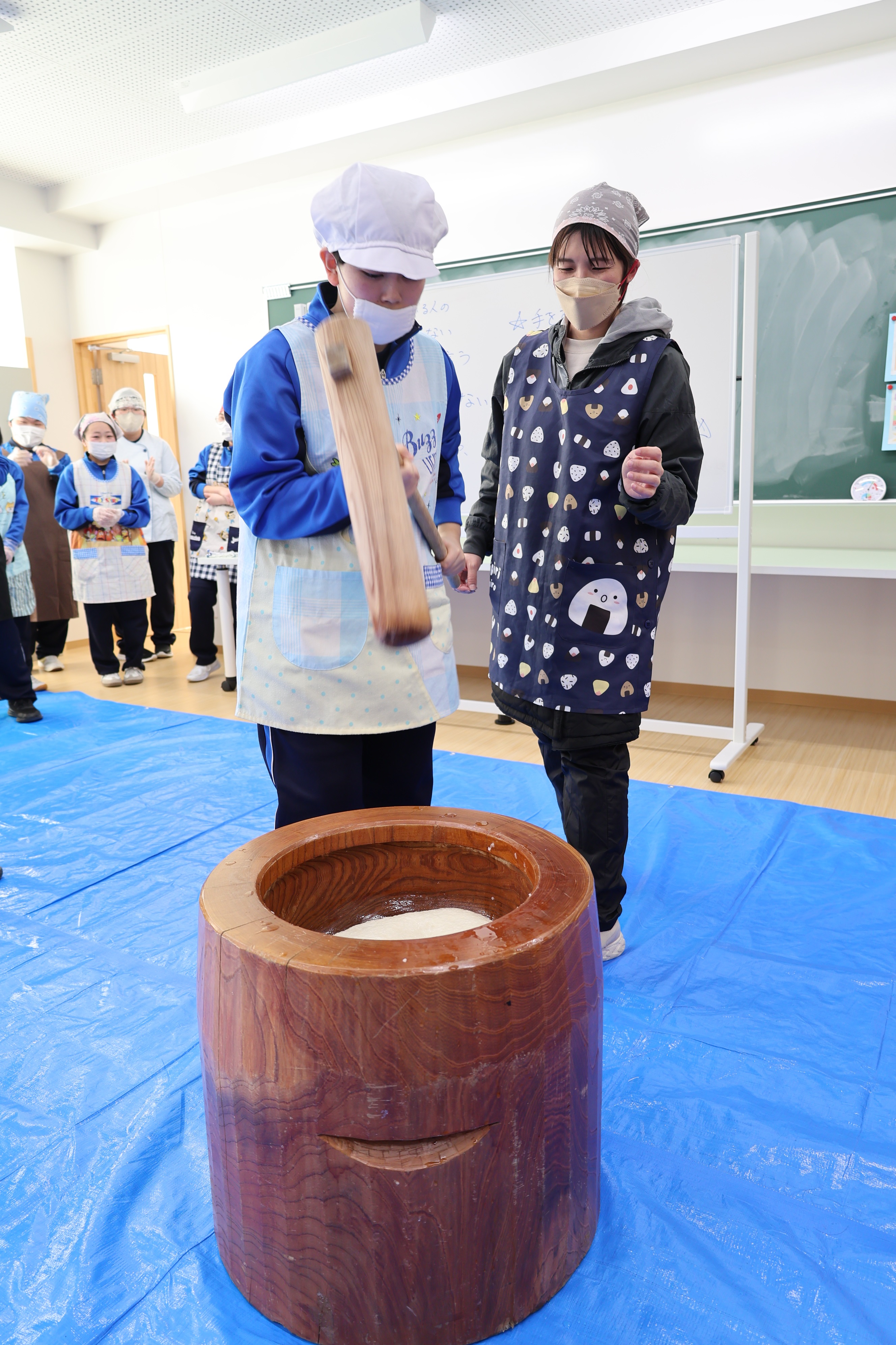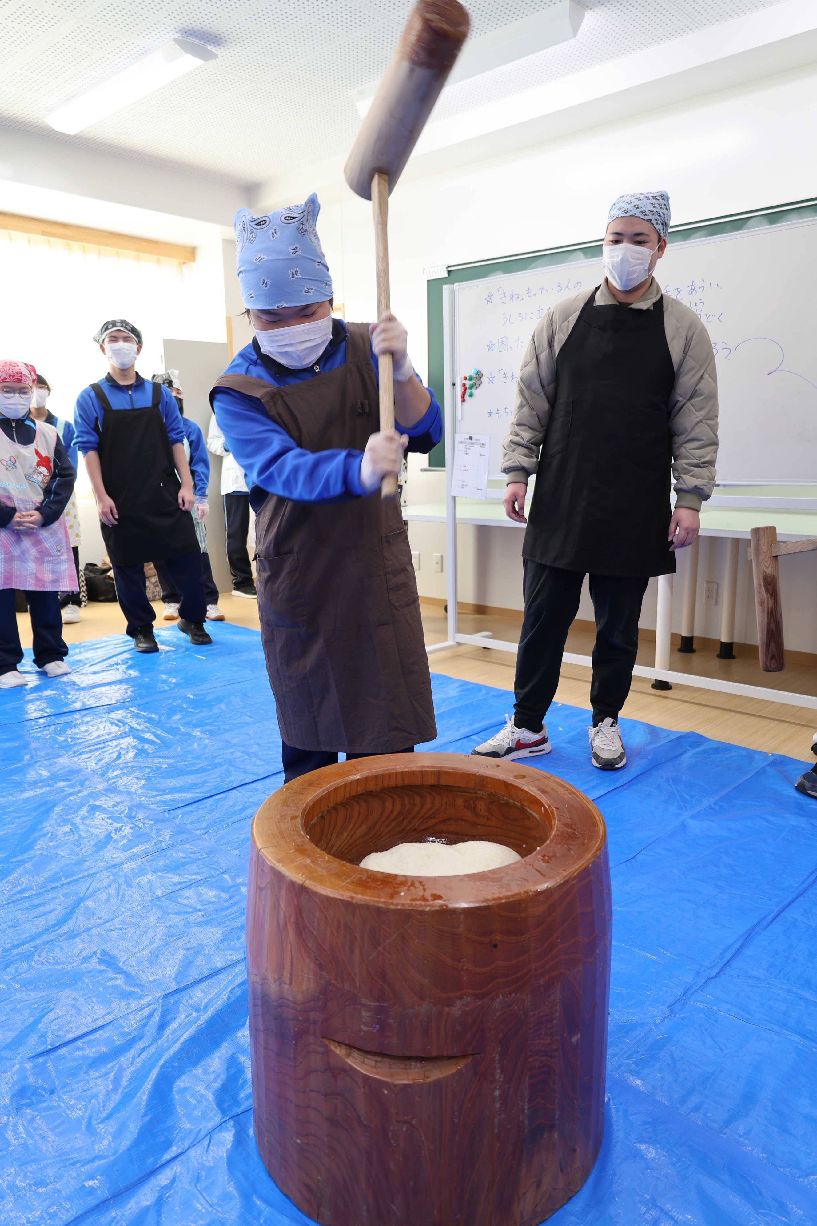 高等部の1~3年生31人と教員、女性部員やJA職員が参加。もちをつく班とあんこやきなこを準備する班に分かれ、女性部員と一緒に取り組みました。もちつきでは、伝統的な手法である千本杵を使い、臼を囲んでもちをつきました。出来上がったもちは、生徒が好きな形に丸め、きなこやあんこをかけて女性部員と一緒に味わいました。