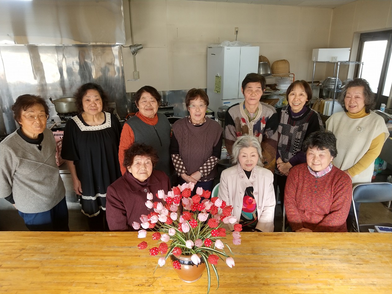 新年会では、まず全員で童謡「1月1日」を合唱し、和やかな雰囲気の中、手芸教室「チューリップ作り」を楽しみました。菅野冨美子支部長の指導のもと赤やピンクの生地を使い、参加者全員で100本を超えるチューリップを完成させました。出来上がったチューリップは、2月4日から6日に開催される作品展に出品する予定です。お昼には、菅野支部長手作りの甘酒で乾杯し、参加者が持ち寄ったお惣菜とともにお弁当を味わいました。参加者は「みんなで食べるご飯はおいしいね」「たくさんのチューリップがひとつにまとまると素敵だね」と話しました。