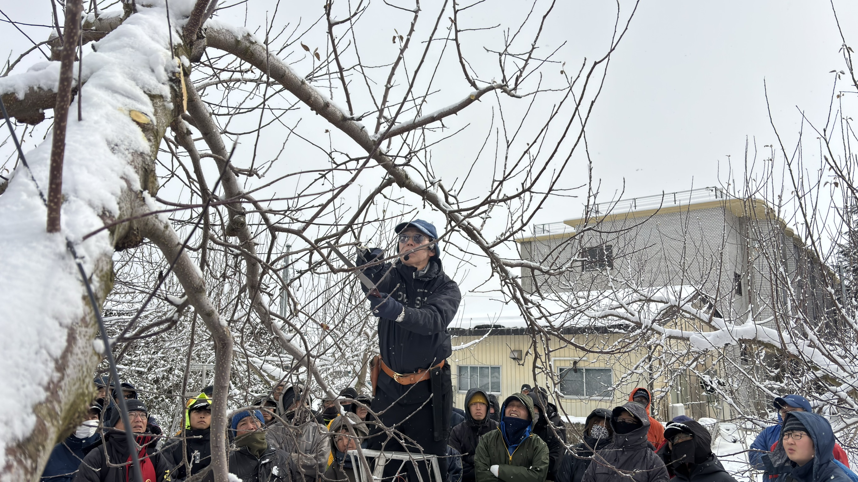 講師には、リンゴ生産日本一の青森県から青森県りんご協会の山本富幸専務を招きました。山本専務は、リンゴ「ふじ」の剪定について、実際にふじ丸葉台の木を使いながら実演を交えて説明しました。