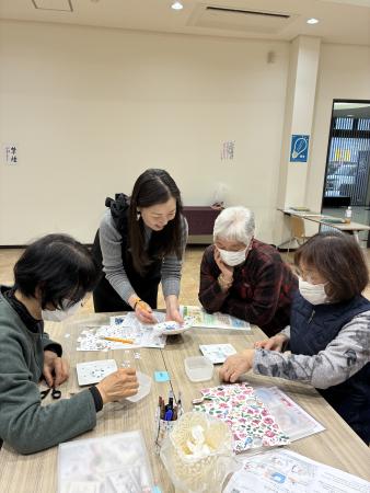 参加者は丸型または四角型のプレートを選び、さまざまな模様の転写紙から好みのイラストを切り取り、プレートに貼り付けてオリジナルデザインに挑戦しました。完成した作品は、講師が持ち帰り電気釜で焼成した後、後日お渡しです。部員は「自分でお皿をデザインできてとてもうれしい。焼き上がりがすごく楽しみ!」と話しました。