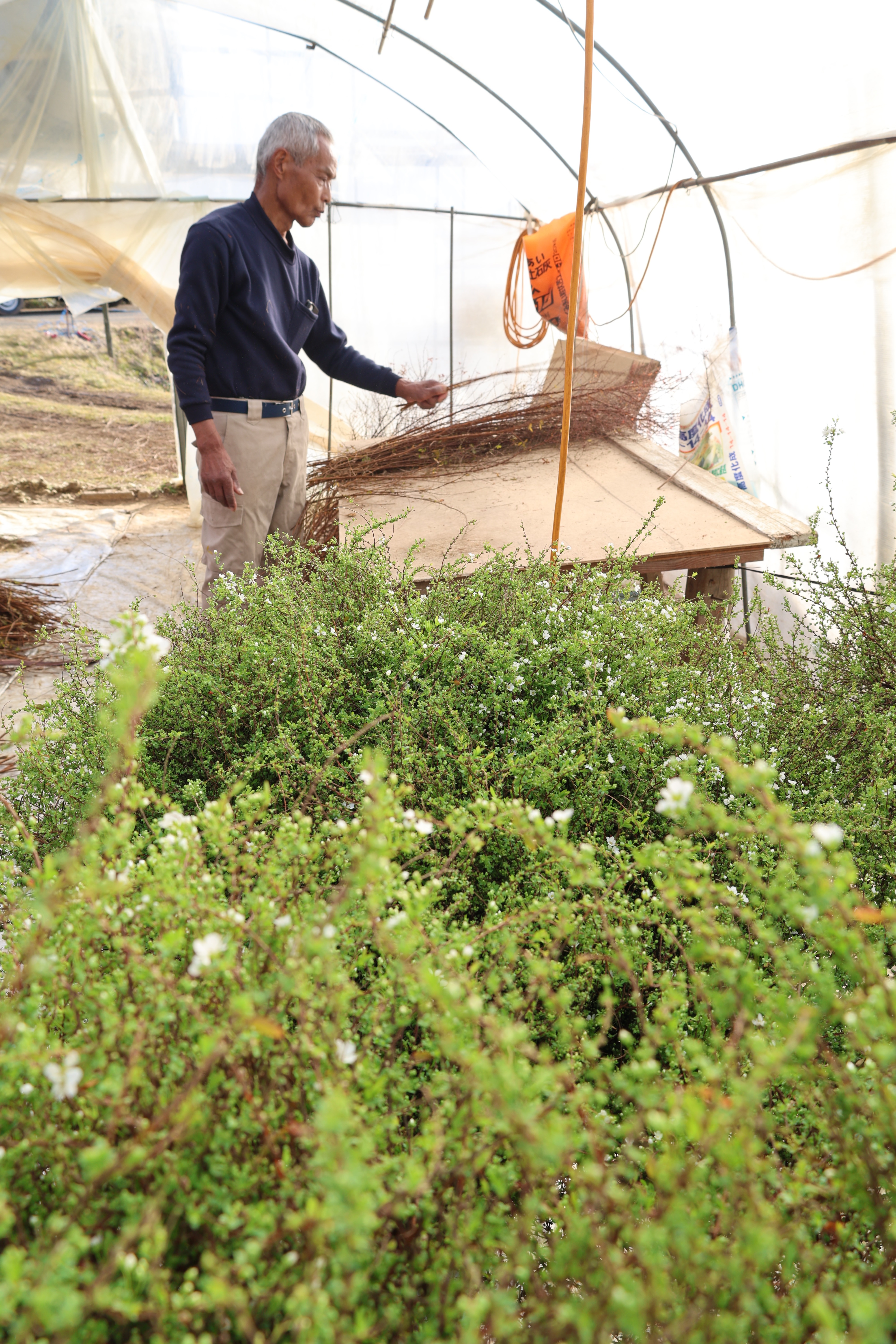 ユキヤナギは枝垂れた枝に白い小さな花をたくさん咲かせます。シンプルで控えめですが、個性を出せる花として需要が高まっています。JAは卒業式や入学式の時期に合わせて促成栽培に取り組んでいます。収穫後3週間程度ハウス内で加温し出荷しています。