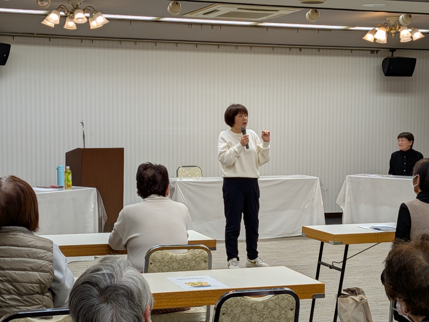 きらり健康生活協同組合 常務理事の渡部典美様が講師を務め「笑いヨガ」を体験しました。渡部さんは「インド発祥の呼吸法を取り入れた有酸素運動で、横隔膜を使いながら、笑うことで“幸せホルモン”が増える」と呼びかけました。参加者は「寒い福島を飛び出し、ハワイに行った気分でリフレッシュできた」と話しました。