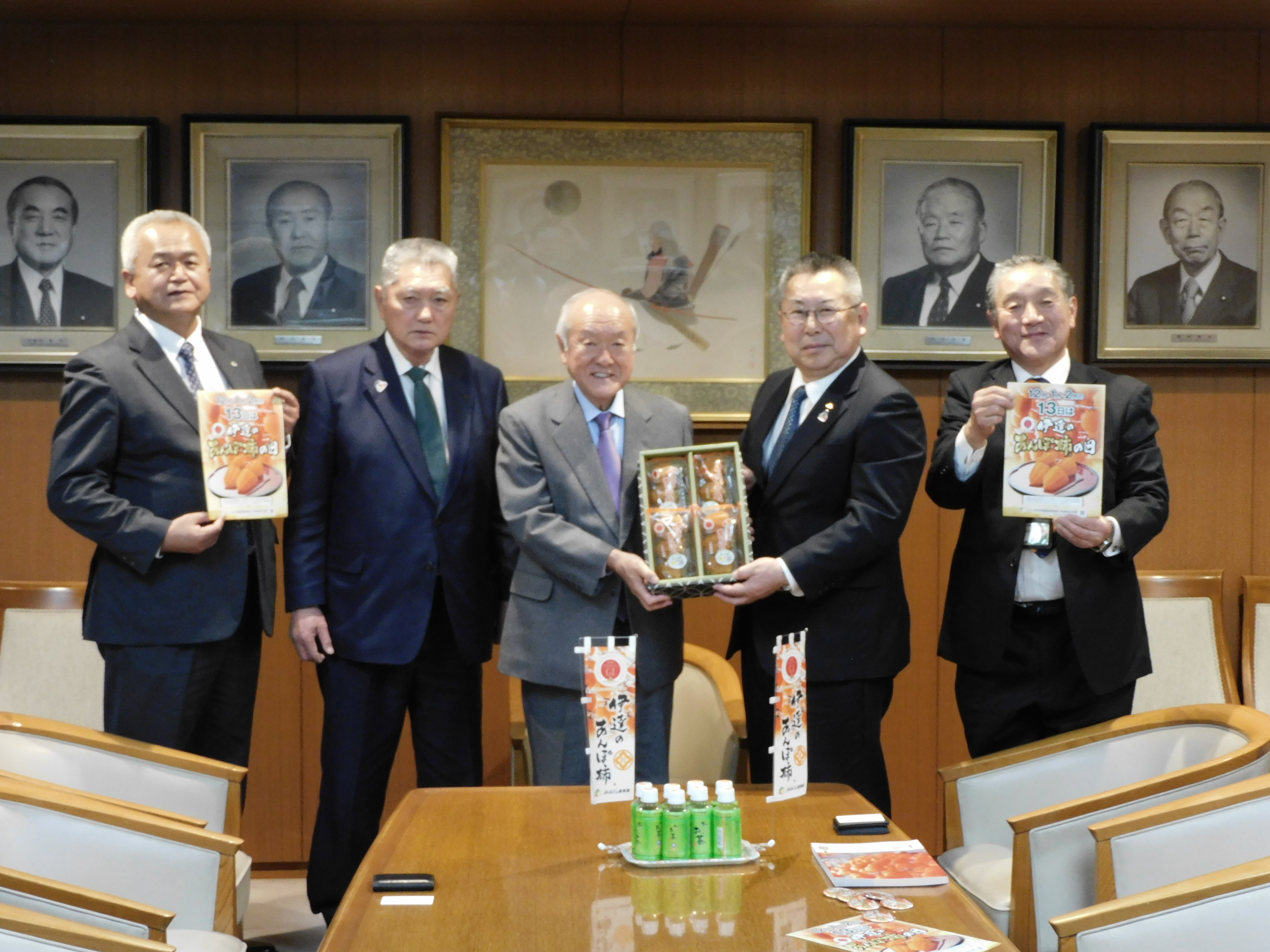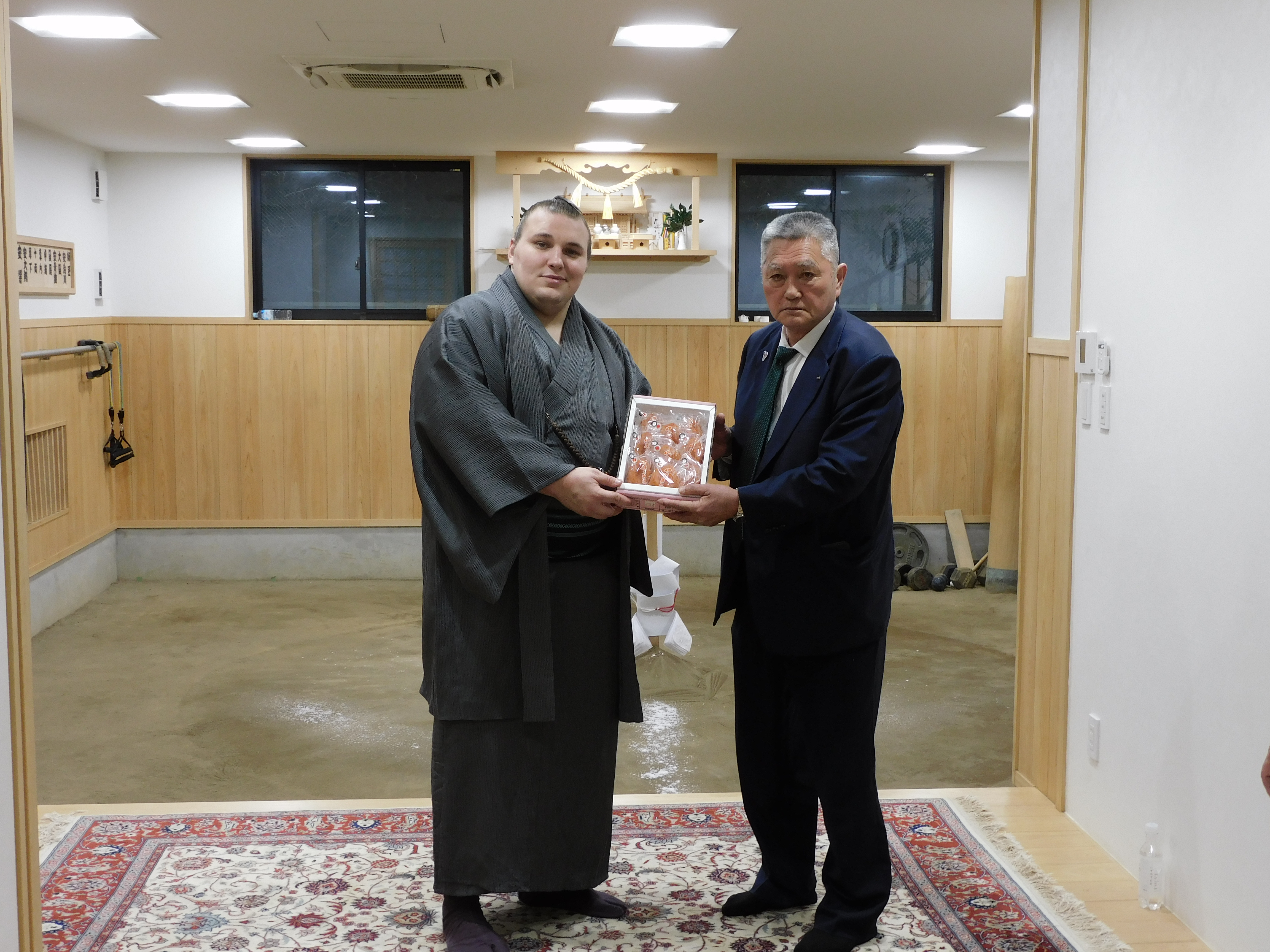 JA福島五連の原喜代志会長と当JA三津間一八組合長らが東京都江東区の安治川部屋を訪ね、副賞を手渡しました。また、自民党本部も訪れ、鈴木俊一幹事長にあんぽ柿を手渡しました。