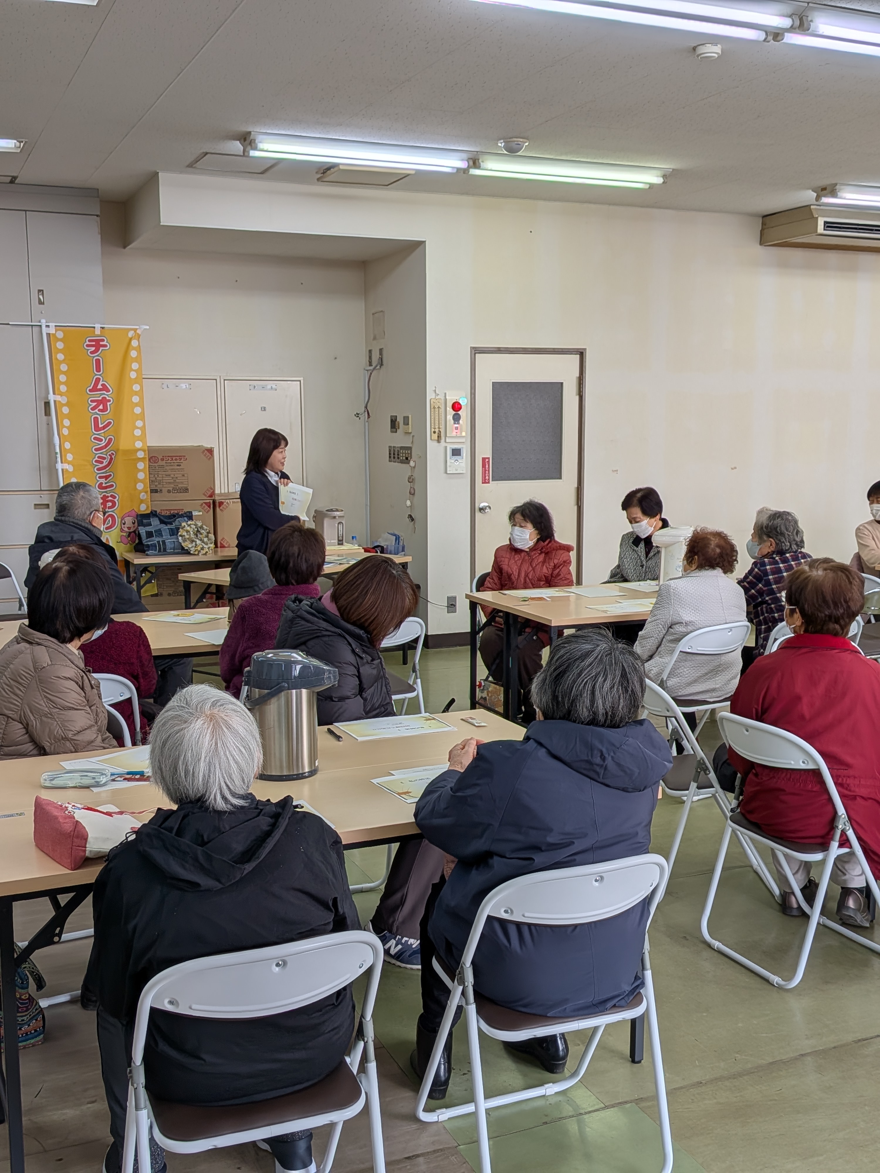2月12日に桑折町社会福祉協議会と連携し、「未来館はんだ」を会場に認知症への理解を深める「オレンジカフェ もんも」を初開催しました。町・社協との協働による新たな取り組みとして、来場者39名、ボランティア9名、事務局を含め総勢50名以上が参加。伊達地区本部地域支援課の菅野紀子主管より「私の終活 明日輝くために」と題して自分の経験からの片ずけやエンディングノートの書き方などの講演を行った後、カフェタイムとしてお茶やコーヒーを飲みながら賑やかに談笑しました。