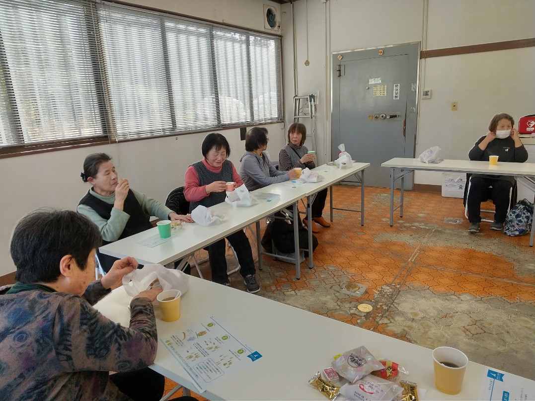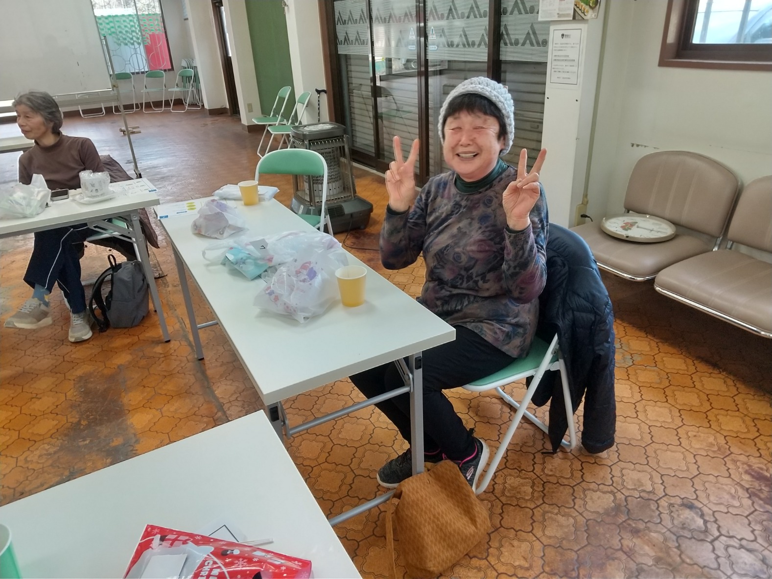 モルックの後はお茶とお菓子を楽しみながら歓談し、参加者が自宅から持ち寄ったプレゼントでお楽しみ抽選会をしました。手編みの帽子や生産したリンゴから作ったリンゴジュースなどが当たり、早速帽子をかぶってみんなに披露する姿も見られました。参加した部員は「久しぶりに参加できてとても楽しかった」「今度は支部長杯のモルック大会もやりたい」と笑顔で話しました。
