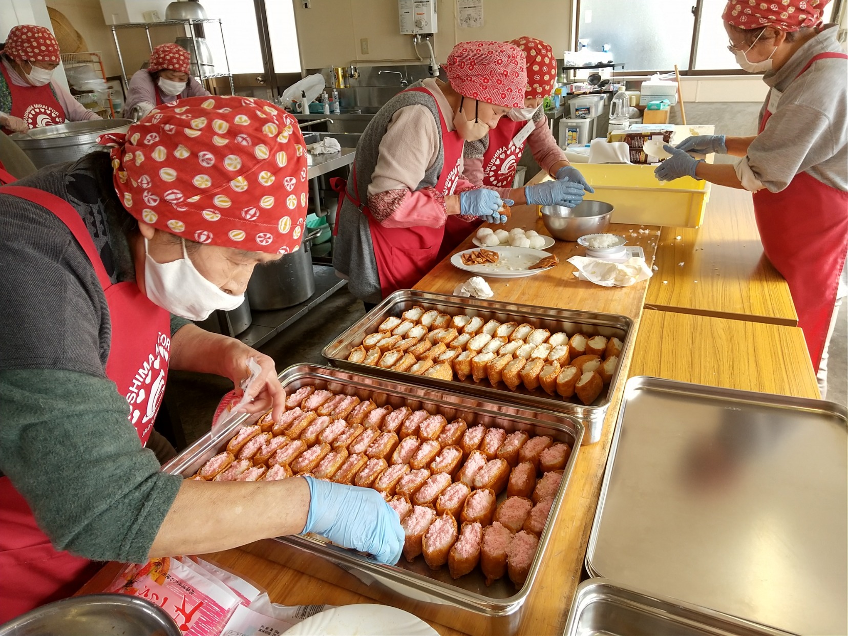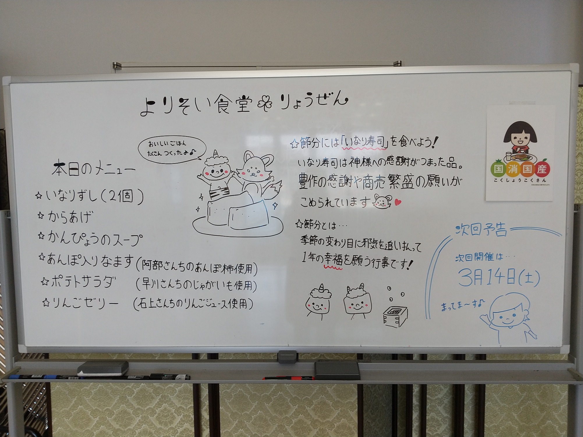 当JA女性部が運営するよりそい食堂☘りょうぜんが14日、みらいホールかけだで開かれました。メニューは節分にちなんで、五穀豊穣・金運アップの縁起物として食べられる「いなり寿司」をはじめ、からあげ、フードドライブで提供された野菜や果物を使ったポテトサラダ、かんぴょうときのこのスープ、あんぽ柿入りなます、リンゴゼリーなどです。74人が来場しました。この日はバレンタインデーで、来場者にチョコレートがプレゼントされました。