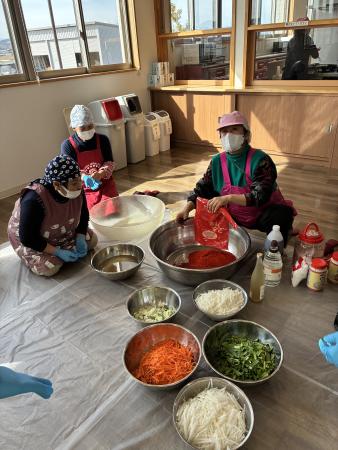 当日は、NPO法人ふくかんねっとのチョン・ヒョンスク氏を講師に迎え、教室では、大根やねぎなどの野菜を刻み、にんにく、あみの塩辛、唐辛子などを混ぜ合わせた調味料を作成。完成した調味料を塩漬けした白菜の葉一枚一枚に丁寧に塗り込み、本格的な即席キムチづくりを体験しました。